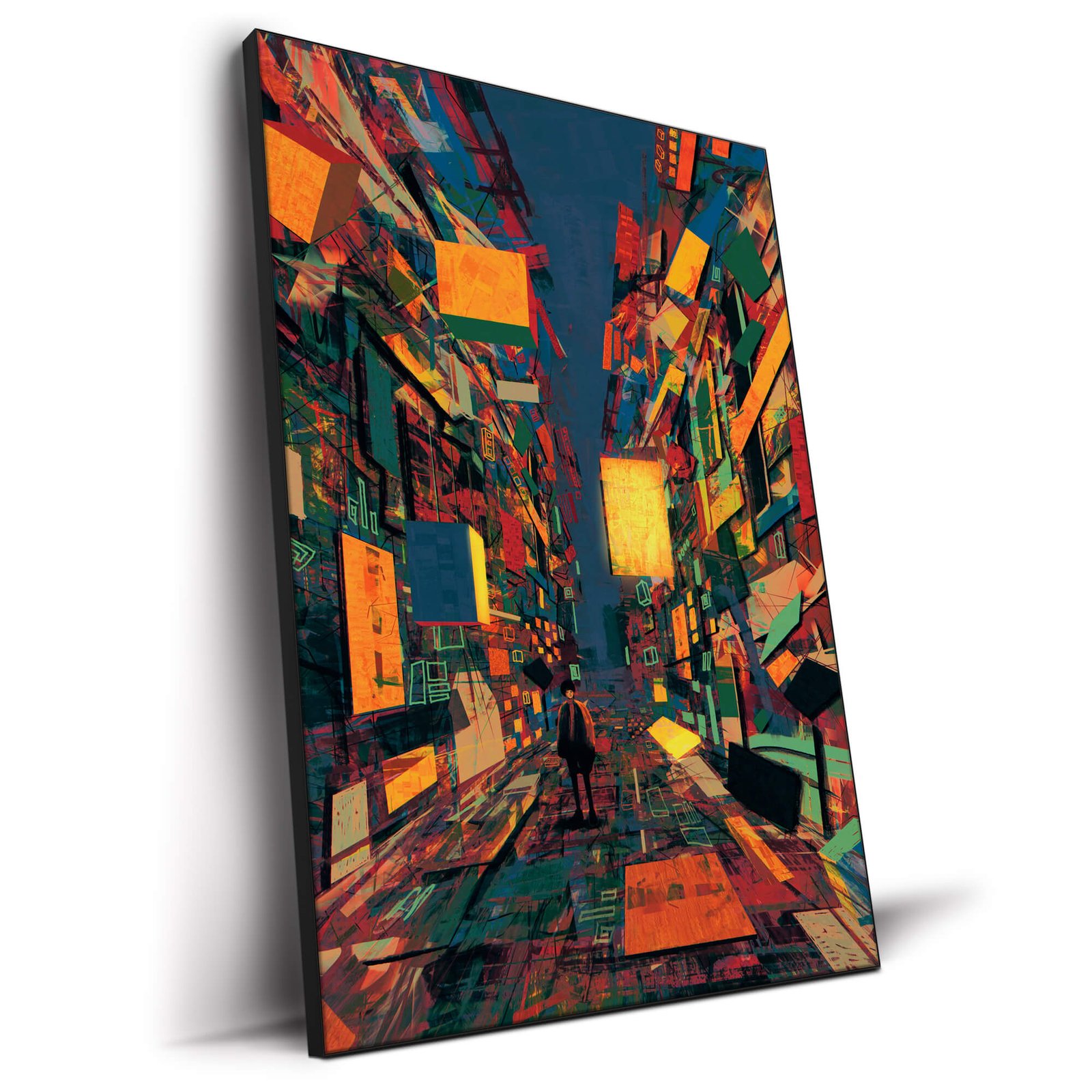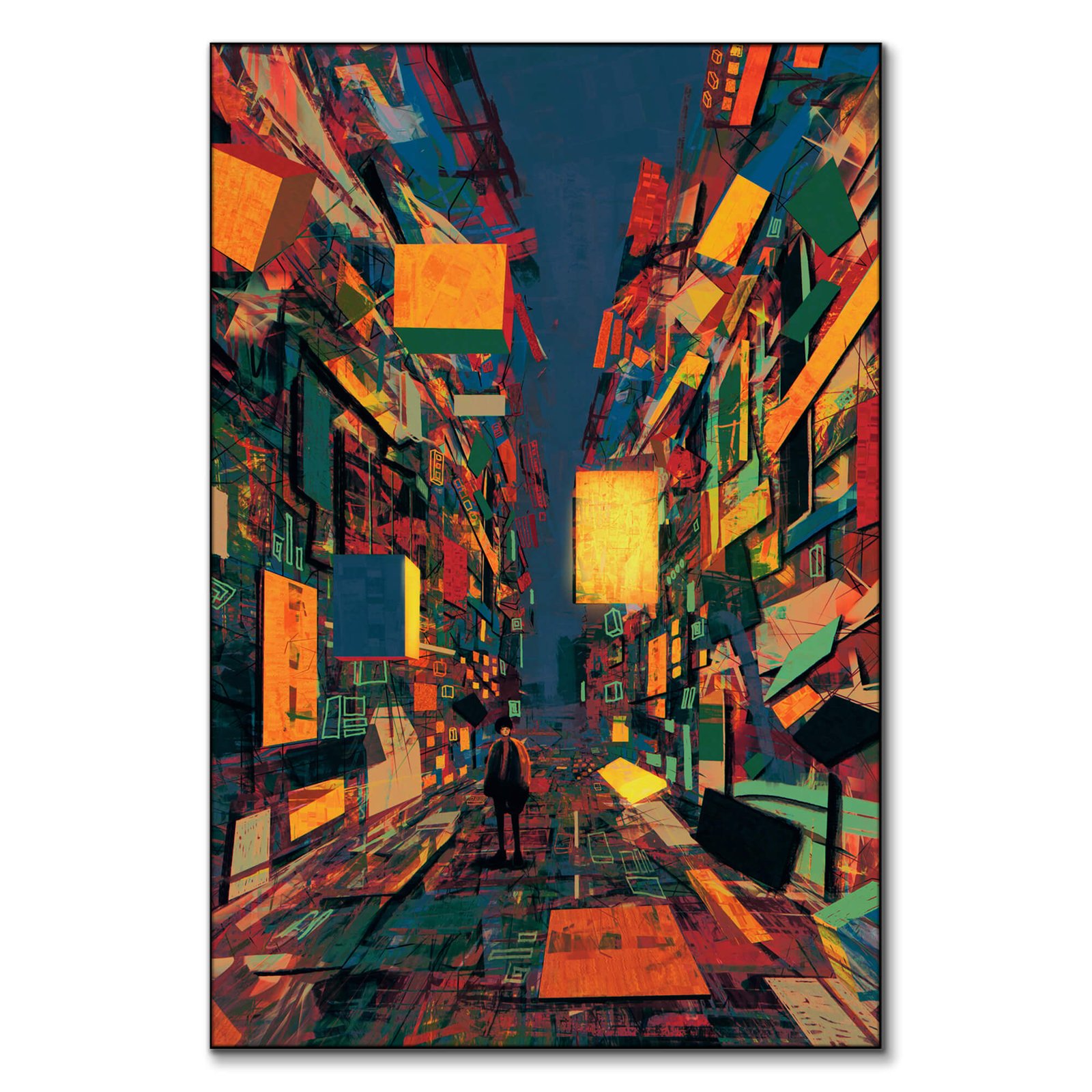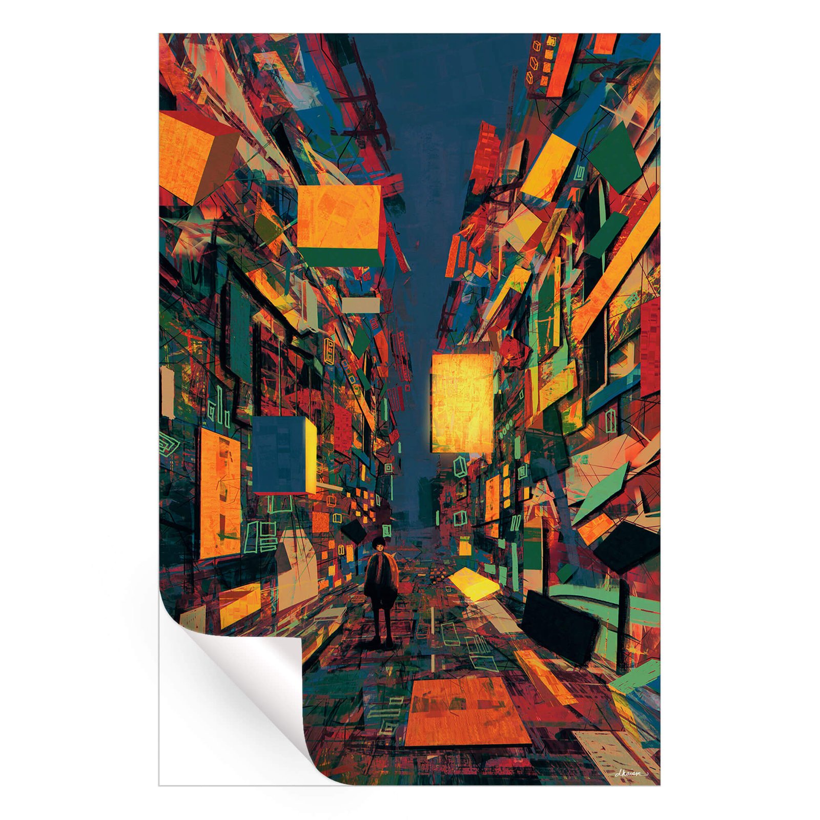 Navigating a maze of abstract geometric city street wall art, a figure moves through a canyon of color and form. The artwork transforms the urban landscape into a surreal tapestry, where buildings become angular mosaics against the sky.