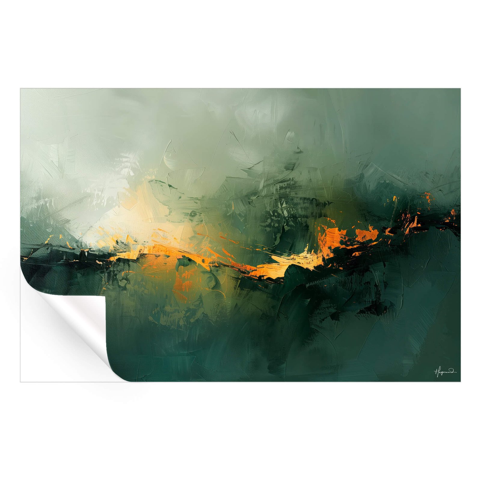 A muted sea of jade wraps the whole scene in quiet dusk. Thick, sweeping strokes rise and fall like distant hills cloaked in fog. At the center a sharp slash of amber and saffron blazes across the horizon, suggesting molten sunlight caught just before night. Tiny flecks of burnt orange flick outward, giving the illusion of sparks leaping from a fire. Deeper forest greens retreat into near-black at the edges, adding depth and calm. Faint knife marks and layered textures keep the surface alive, letting light dance on every ridge. The horizontal layout stretches the glow from edge to edge, guiding the eye in a slow journey. Signed subtly in the lower right, the print balances bold motion with serene color.