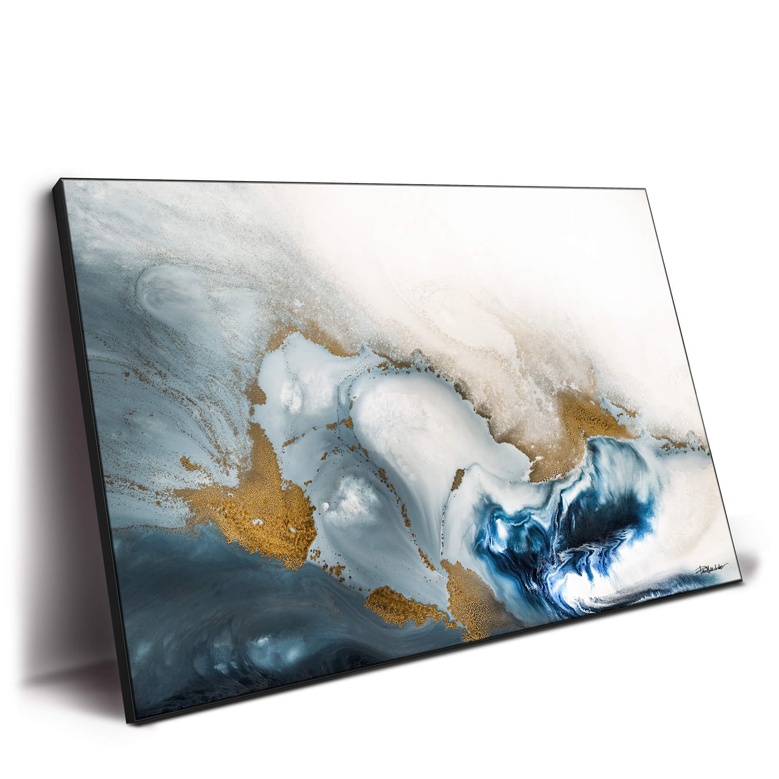Australian artist Petra Meikle de Vlas art prints are guided by her life beside the Great Barrier Reef. She constantly experiments with fluid pigments and metallic powders, letting gravity mimic ocean flow. The shimmering gold in this artwork echoes sunlight on shallow coral shelves, a signature element throughout her collections. Petra thrives on rule breaking and risk taking which gives every print an adventurous spirit.
