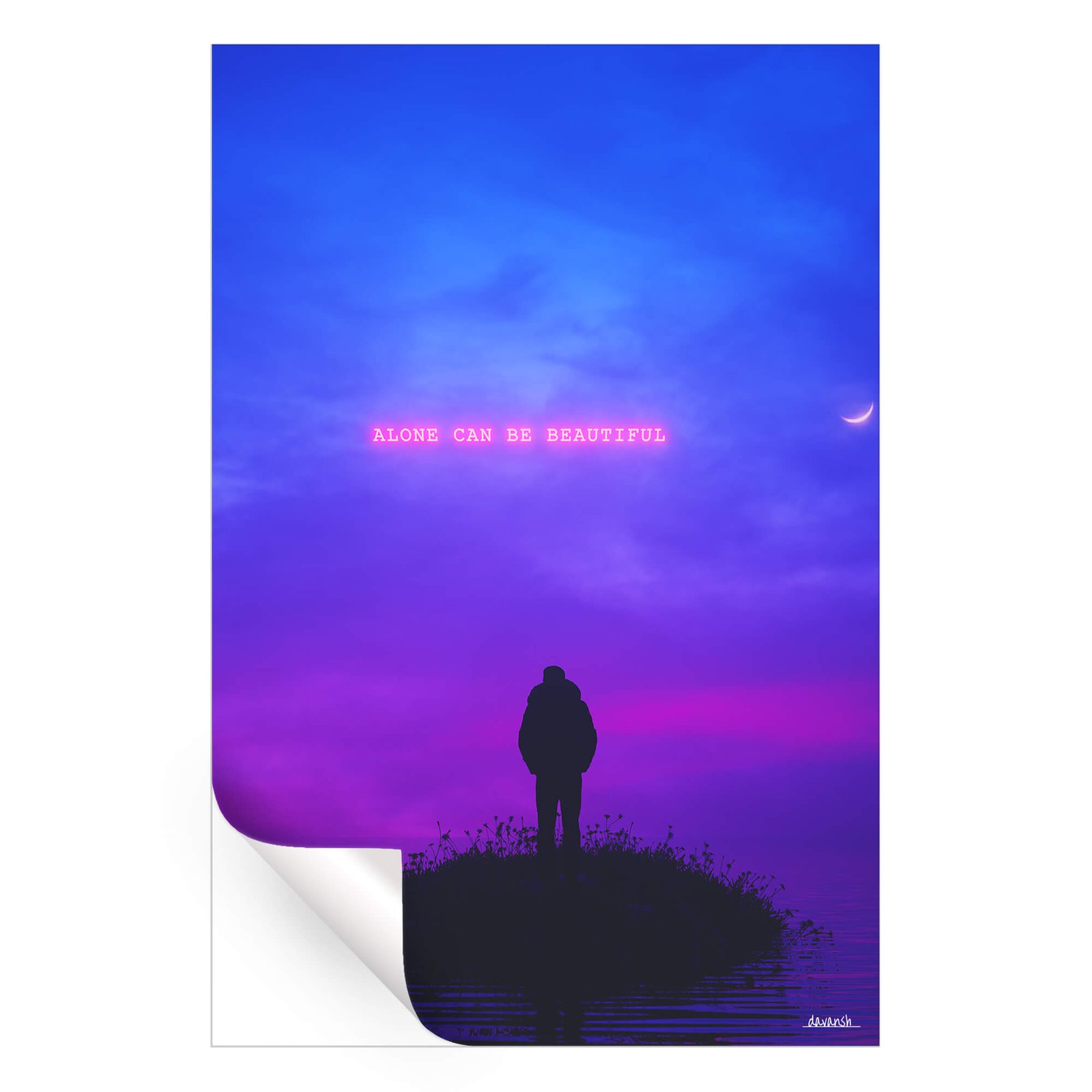A solitary figure stands on a small island, gazing into a vast expanse of vibrant colors blending from blue to purple, reflecting a serene sunset. The figure’s silhouette contrasts beautifully against the pastel hues, and the text “ALONE CAN BE BEAUTIFUL” in glowing letters adds a contemplative touch. This artwork captures the essence of solitude and self-reflection amidst nature’s breathtaking backdrop.