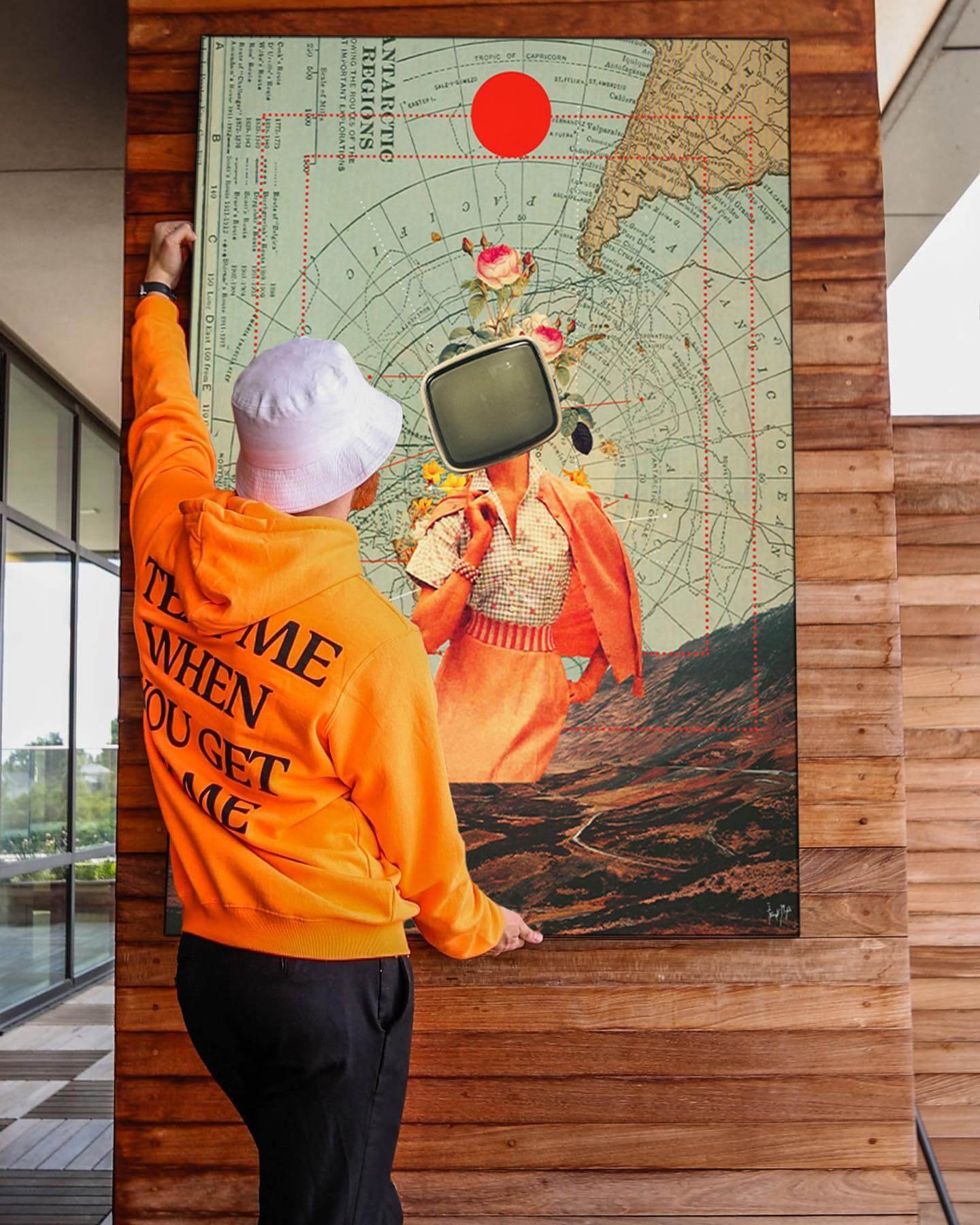 A figure stands before a map of navigational lines and topographical contours, their head replaced by a vintage television set. Blooms and leaves sprout from the top of the TV, suggesting a fusion of technology and organic growth. The figure’s attire is reminiscent of mid-century fashion, and they seem to be on a journey, guided by the map behind them.