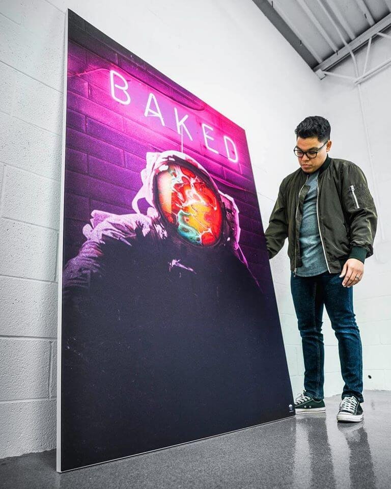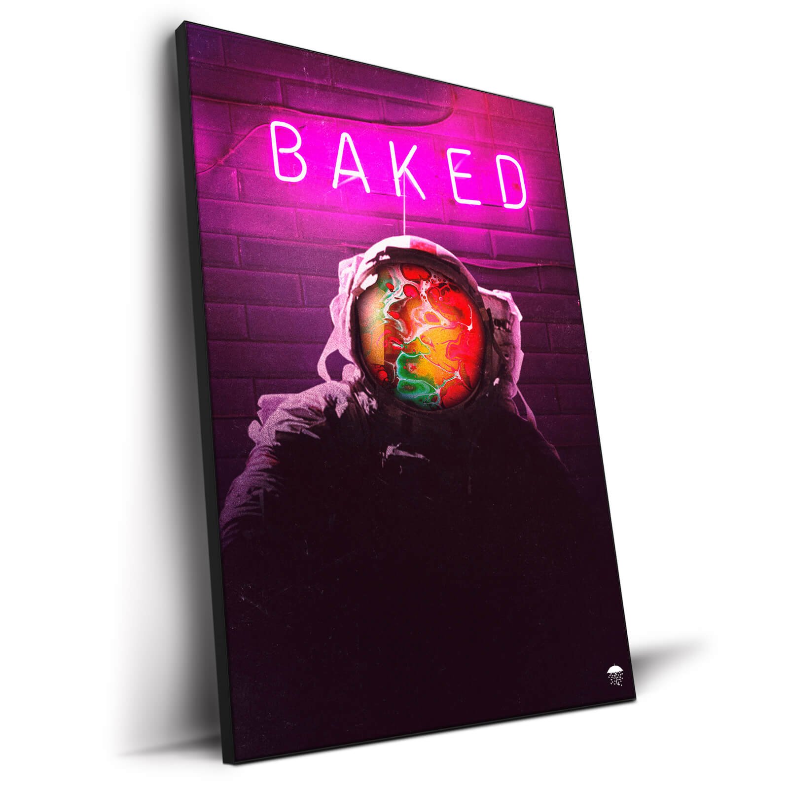 An astronaut stands against a wall where the word “BAKED” shines in neon pink lettering. The astronaut’s helmet visor reflects a swirl of vivid colors, inviting a psychedelic and otherworldly experience.