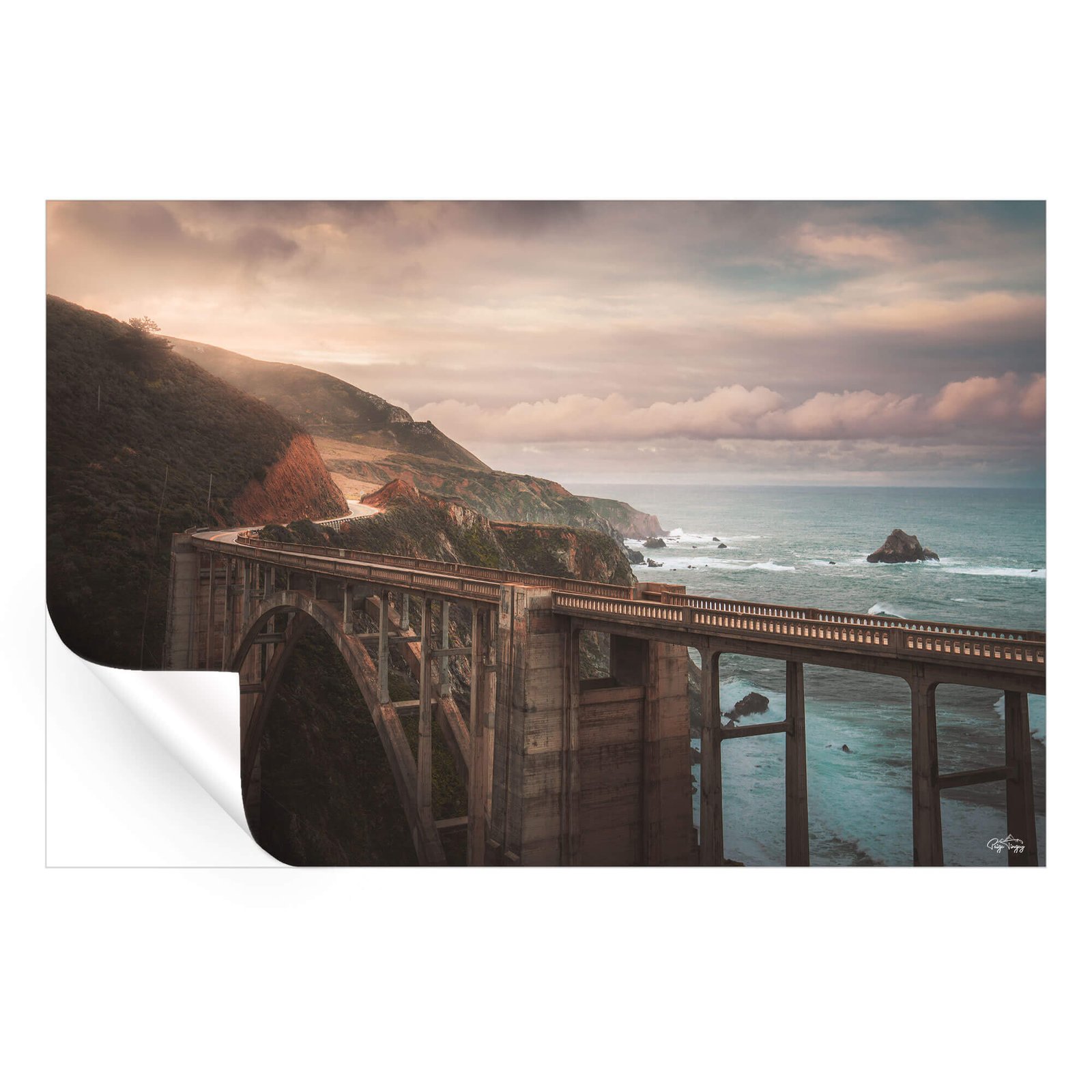 This striking print presents the iconic Bixby Creek Bridge, a jewel along California’s scenic Highway 1. The majestic structure stretches across the rugged coastline, a testament to human ingenuity harmonizing with the wild beauty of the Pacific shores.