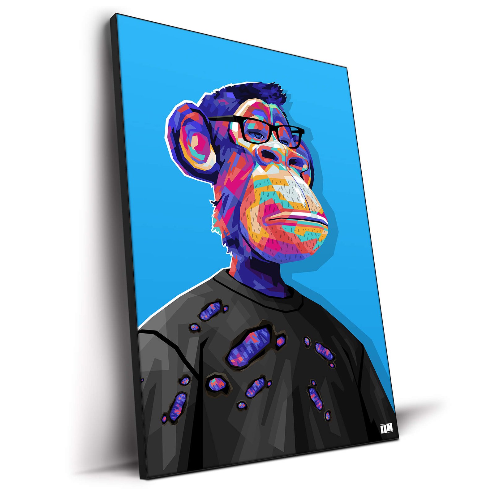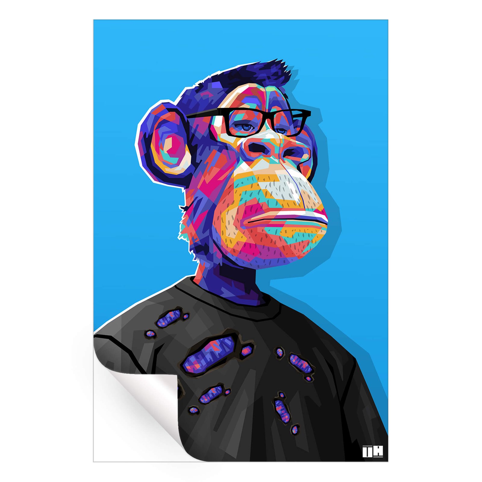 A vibrant pop-art style portrait of a chimp wearing glasses and a distressed black shirt. The colorful geometric patterns in shades of purple, blue, pink, and yellow create an energetic visual against a bright blue background. The chimp’s cool, composed expression contrasts with the vibrant color scheme, adding a modern, edgy vibe. This “Vibrant Glasses-Wearing Ape Pop Art” is perfect for those seeking a bold, artistic statement.