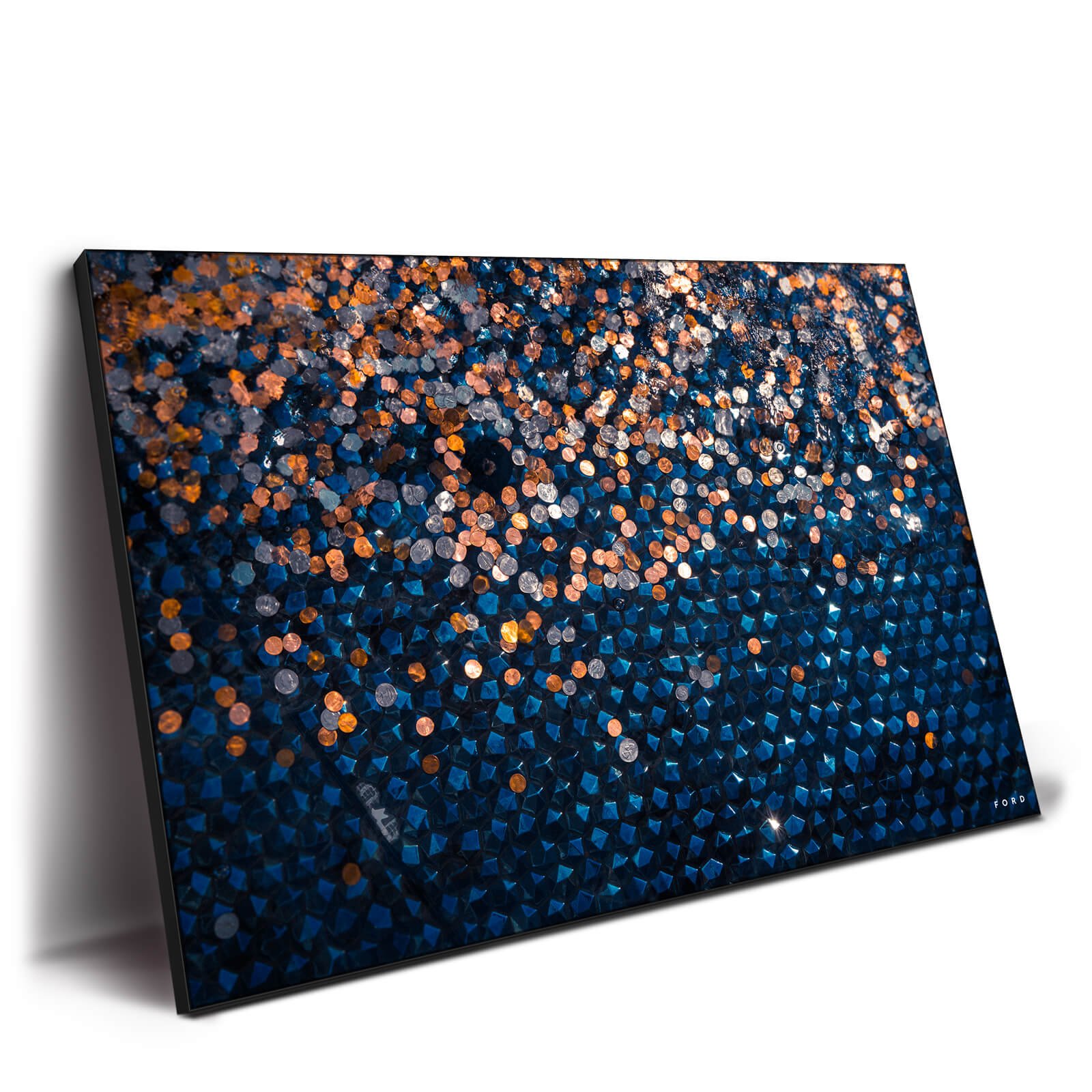 The tonal balance of copper and blue makes the image feel simultaneously urban and seasonal, echoing the streetlights of early autumn. Gentle reflections dance as you move, giving the print life throughout the day. Whether backlit in a Lightbox Frame or simply mounted in black aluminum, the artwork retains its serene glow.