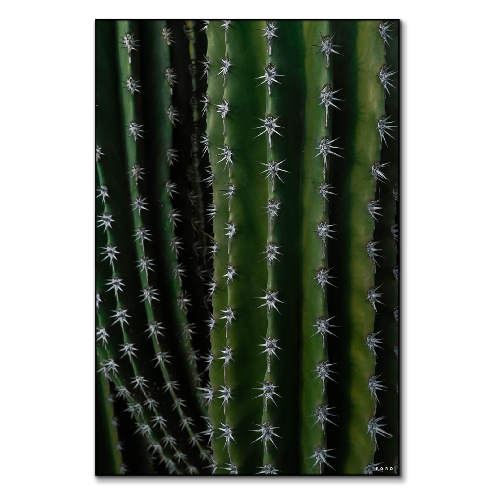 Tall, slender cactus columns rise in the frame, covered in a pattern of sharp, white spines that stand out against the plant’s deep green flesh. The spines cast subtle shadows, accentuating their defensive architecture and the cactus’s adaptive resilience. Light plays across the surface, highlighting the cactus’s ridges and the natural symmetry of its thorny armor.