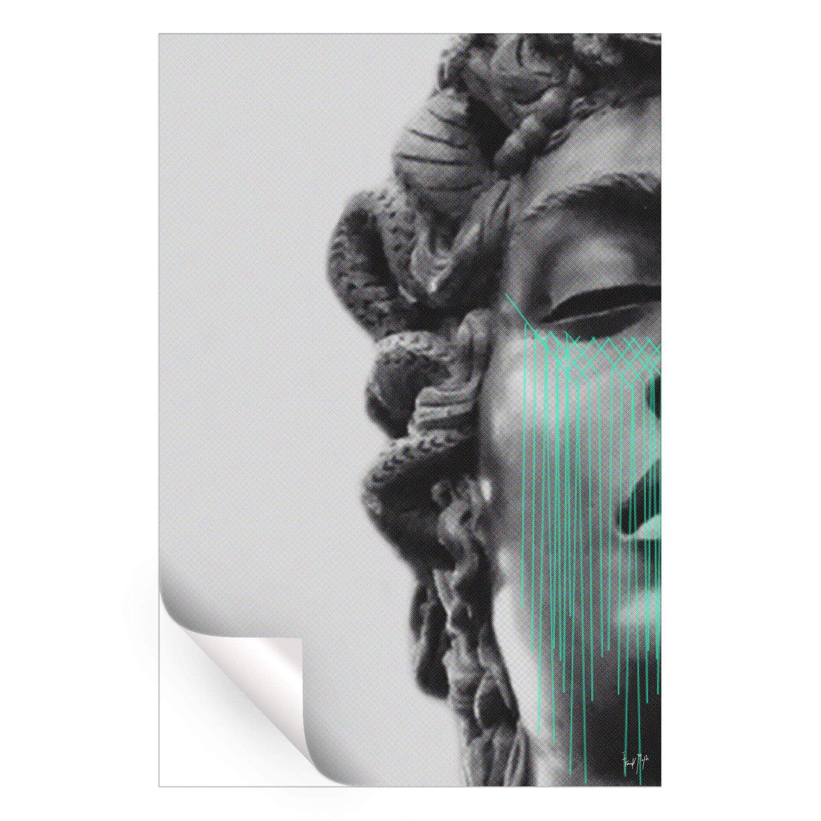 The head of Medusa is captured, with intricate curls and swirls of snakes, captured in stone. Streaming from the eyes, a cascade of teal lines pours forth, suggesting digital tears. A fine texture has been overlaid on the piece, adding texture. These vibrant streams create a stark juxtaposition with the gray of the sculpture, offering a modern twist on the timeless art form.