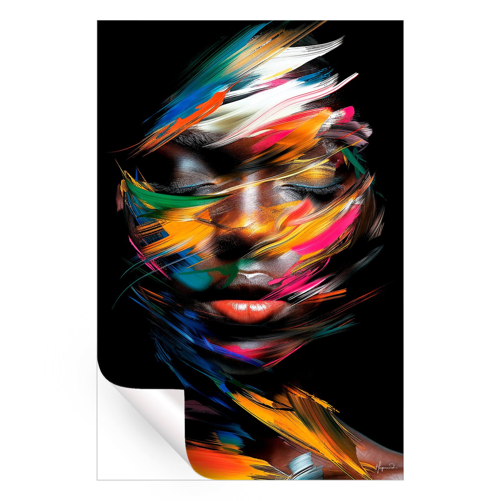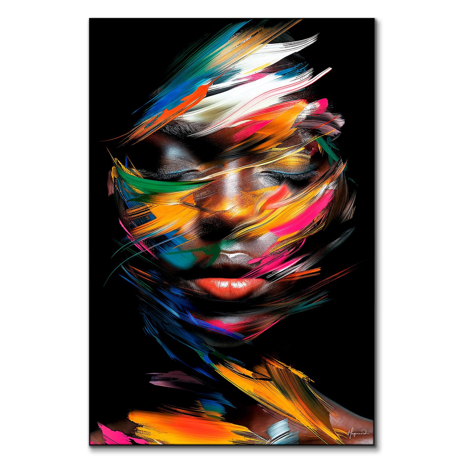 This portrait merges abstract expressionism with vivid, contrasting colors to evoke emotional depth. The subject’s face is softened by layers of paint, with streaks of red, yellow, and green forming an intense yet fluid composition. The combination of fluid brushstrokes and bold color choices brings a sense of passion and intensity to the piece.