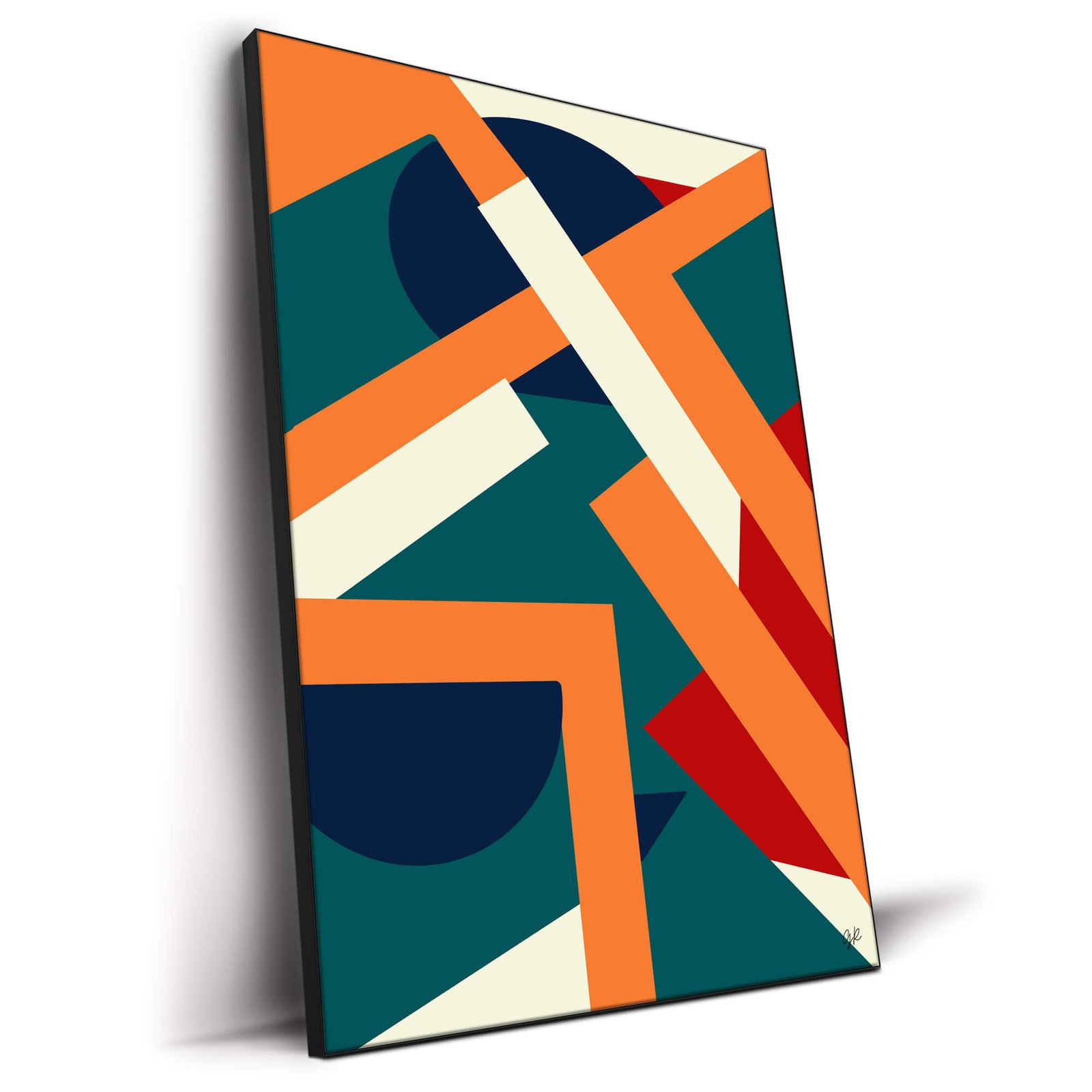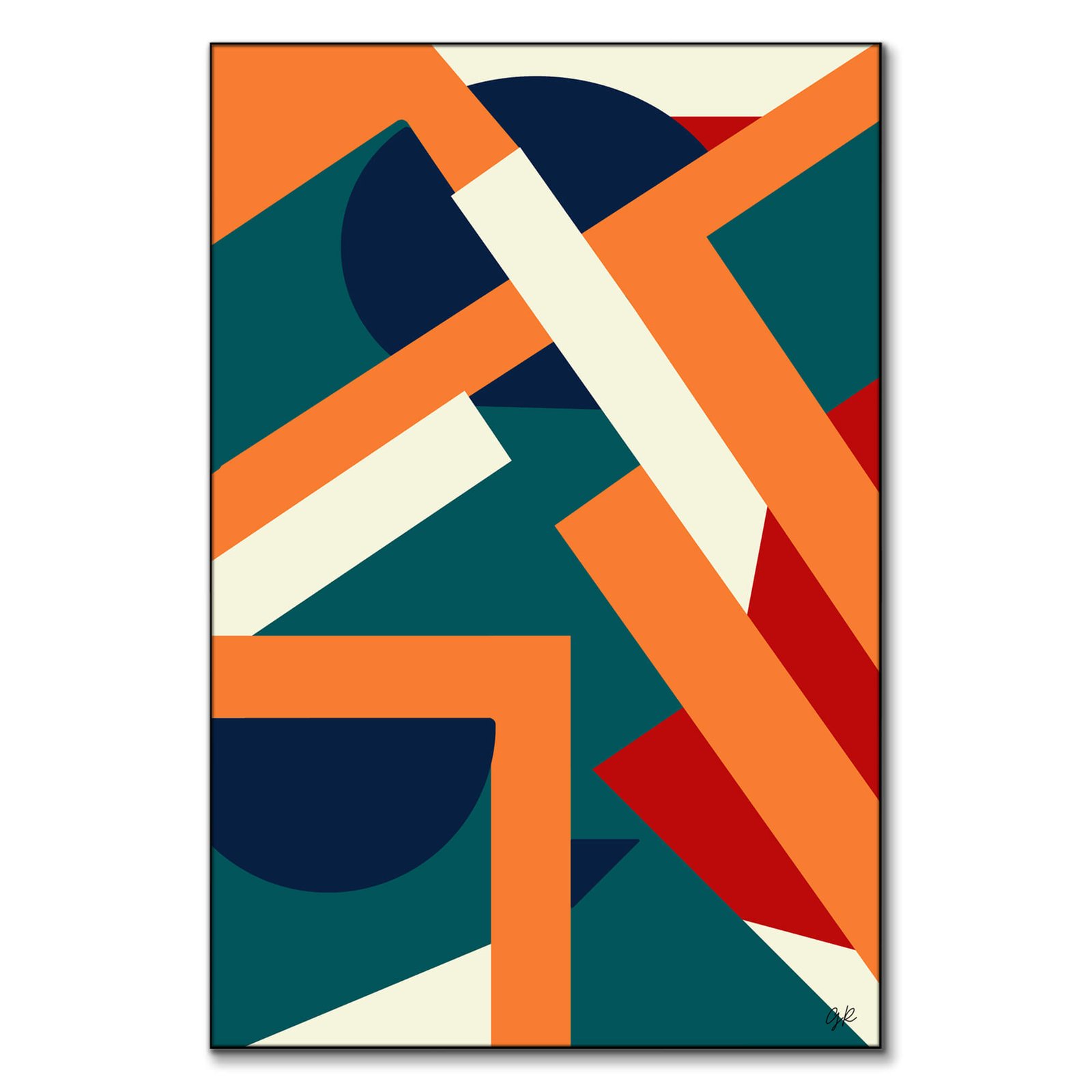 A mosaic of rectangles and triangles in shades of teal, navy, orange, and cream overlap and intersect, creating a sense of structured chaos. The elements, confined within the borders of the artwork, suggest a balance between order and dynamism.