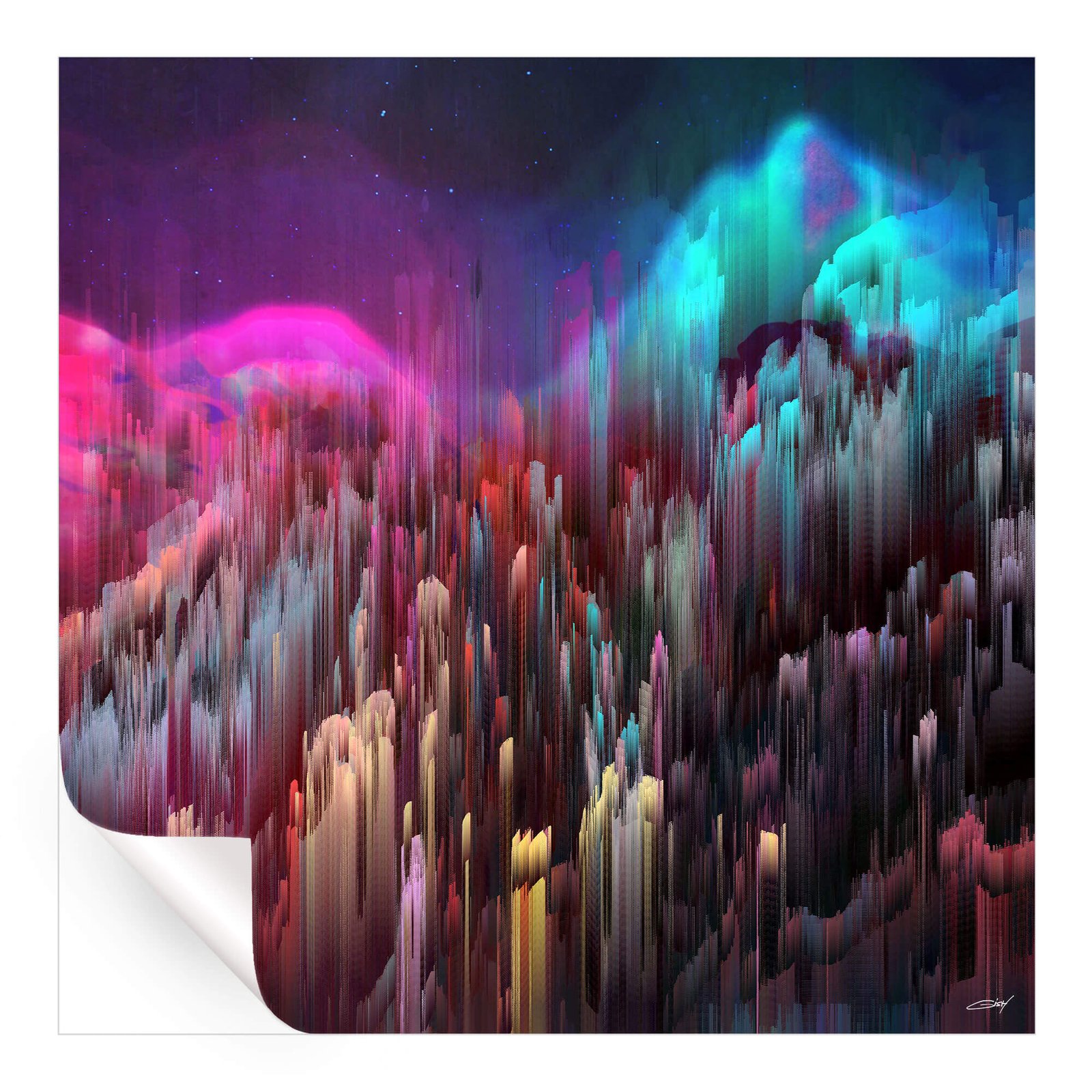 Vertical streaks in varying hues create a rhythmical, vibrant scene that resemble the northern lights.