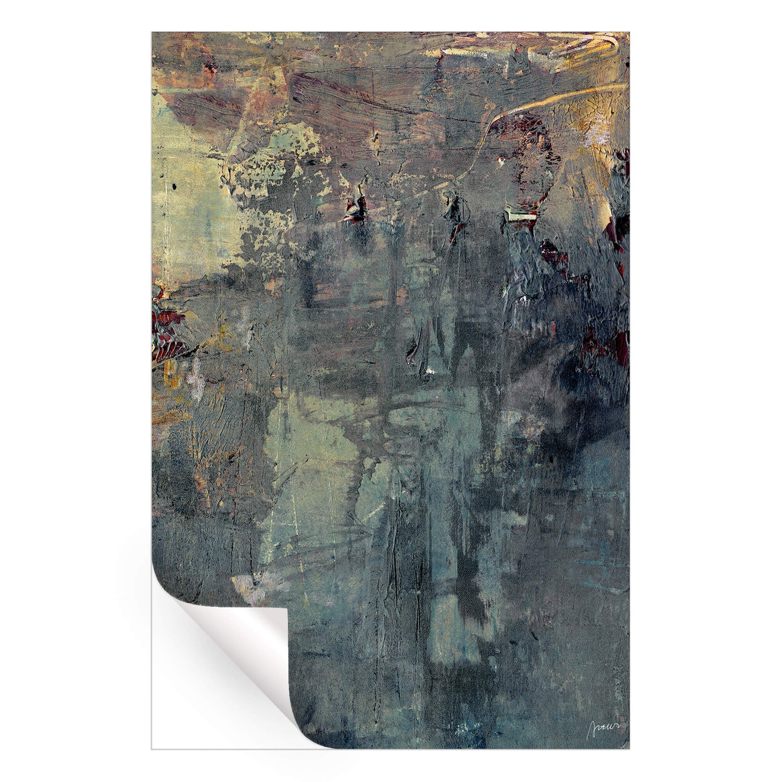 Dark tones blend with intricate textures in this distressed abstract piece. The layered composition combines muted hues of gray and black, highlighted by flashes of warm gold and orange. Soft brushstrokes mix with rough textures, creating an industrial feel that invites contemplation.