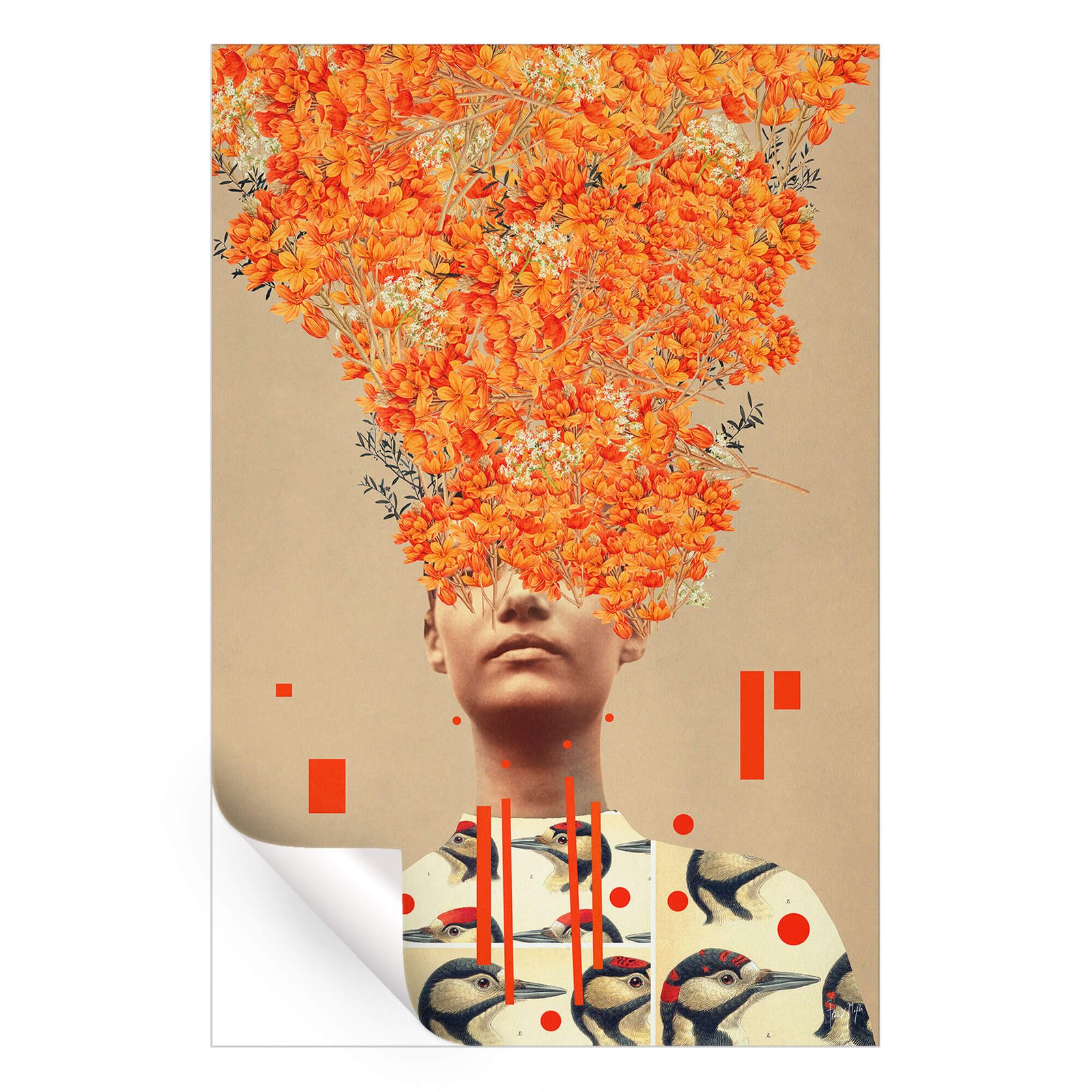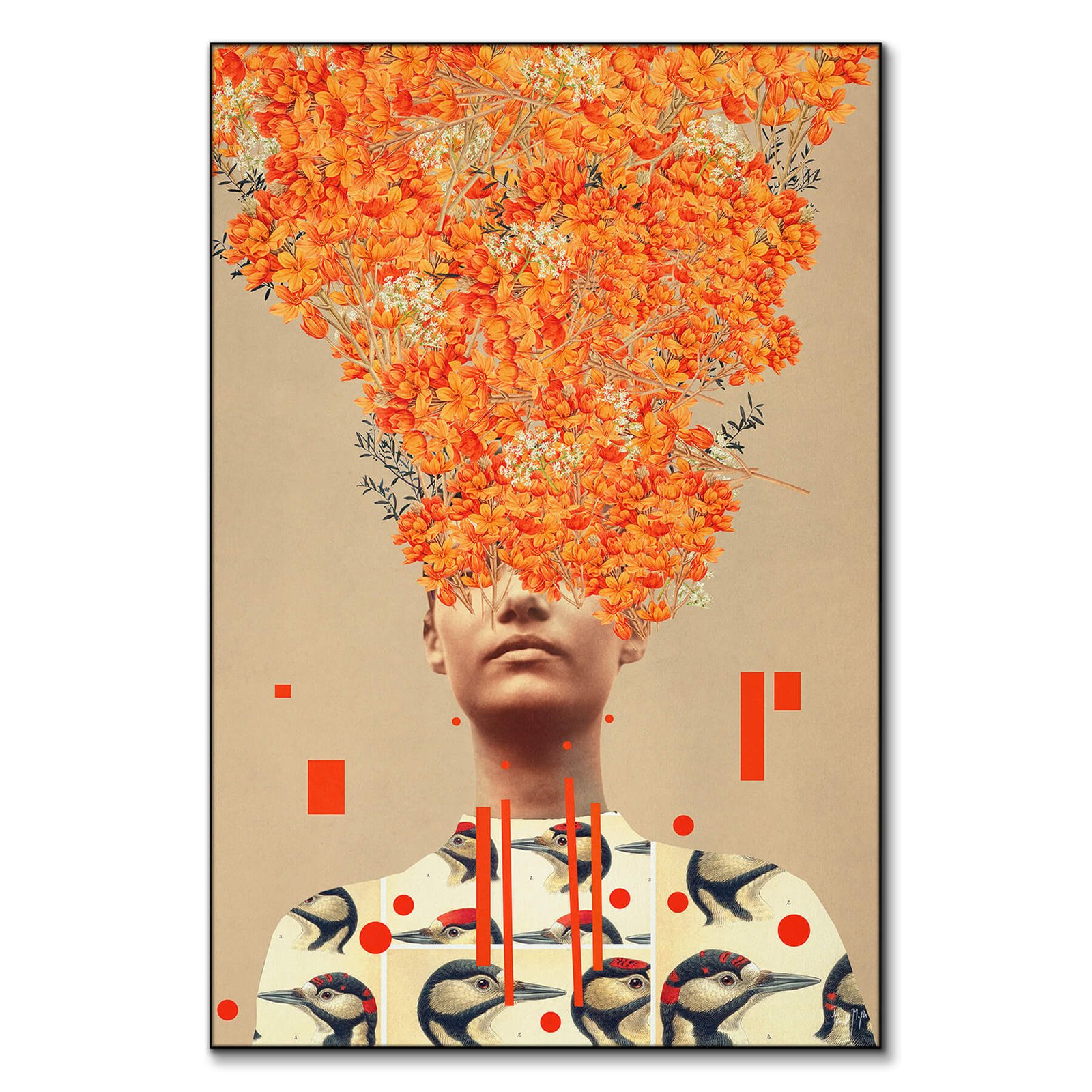The piece belongs to our large surreal wall art and flower head art print collections, merging fashion portrait with florals for bold fall décor. Warm orange tones complement wood accents, leather furniture, or boho throws, adding instant coziness to living rooms, studios, and creative offices. Fans of fall inspired wall décor, maximalist artwork, or eclectic vintage spaces will appreciate its layered narrative and vibrant color play. If you crave something even more personal, explore our custom photo collage print service for bespoke designs.