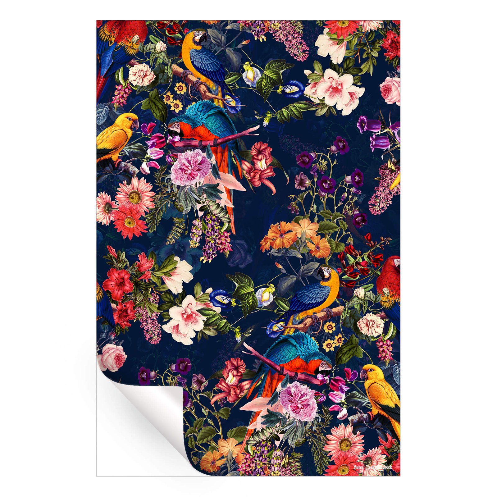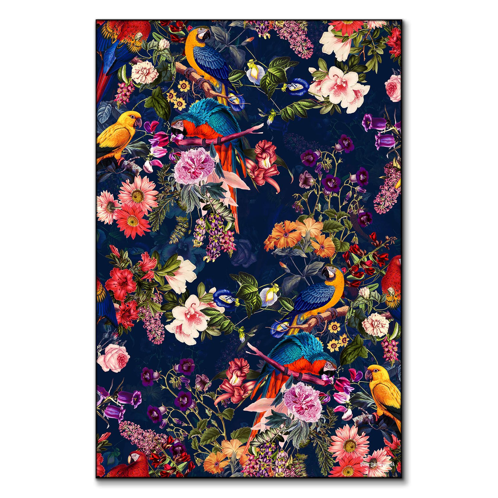 Perched among flowers, a bright array of birds, such as parrots, are drawn with bright plumage in shades of blue, yellow, and red. The flowers, which come in a range of colors including pink, orange, and purple are beautifully detailed.