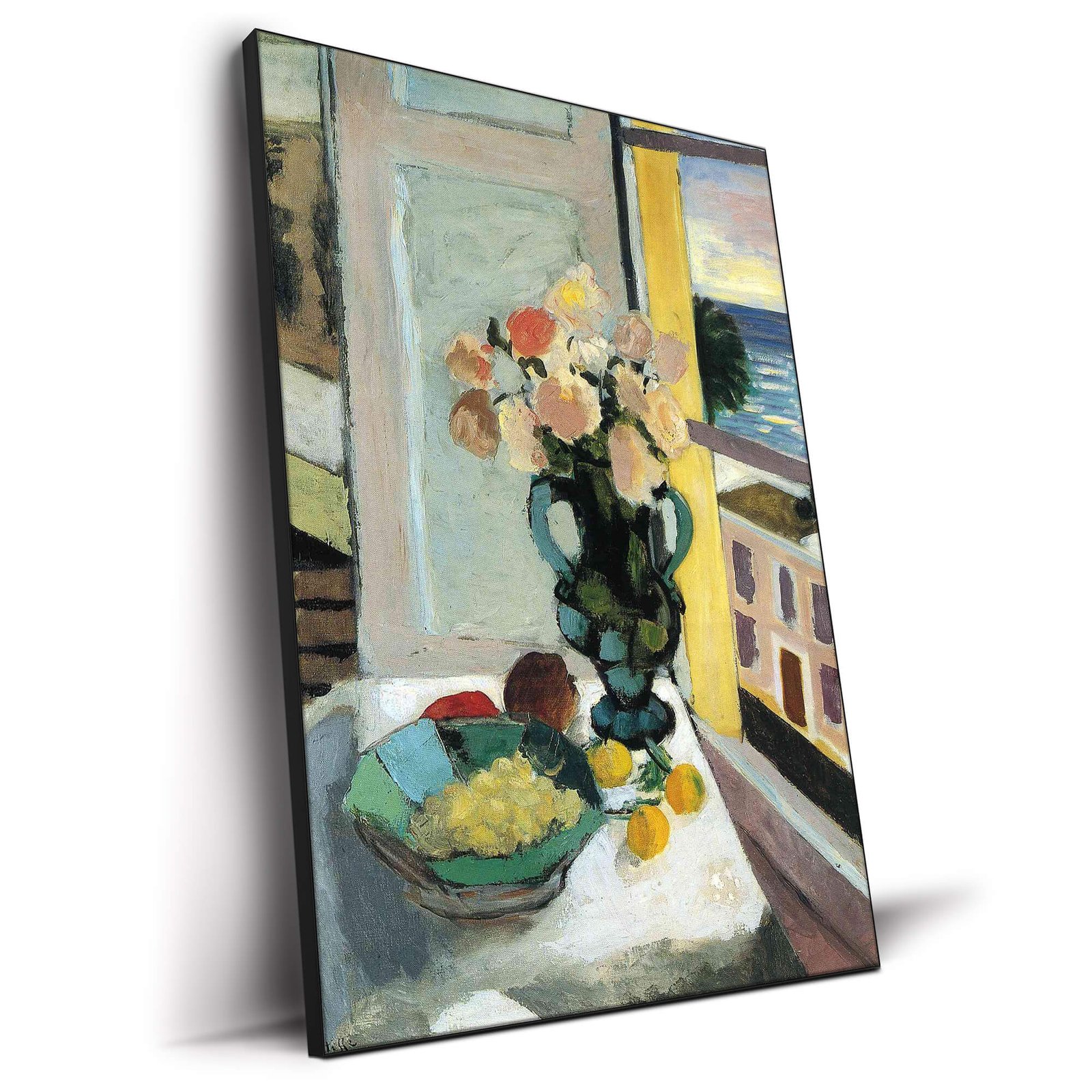 Flowers in front of a Window by Henri Matisse shows a tall turquoise vase brimming with cream, blush, and terracotta blooms stands on a white-draped table. Sun-washed petals glow against a pale mint wall while a yellow window jamb opens to distant palm trees and a shimmering horizon. A green bowl full of grapes, two lemons, and a red apple add casual still-life charm. Thick, confident brushstrokes give the scene a relaxed Mediterranean rhythm. Evening light flickers on the water, and the facades of nearby buildings appear in mauve and ochre rectangles. Every element is rendered in airy pastels, letting color carry the romance. The vertical layout guides the eye from tabletop to sky, wrapping the viewer in a mellow calm.