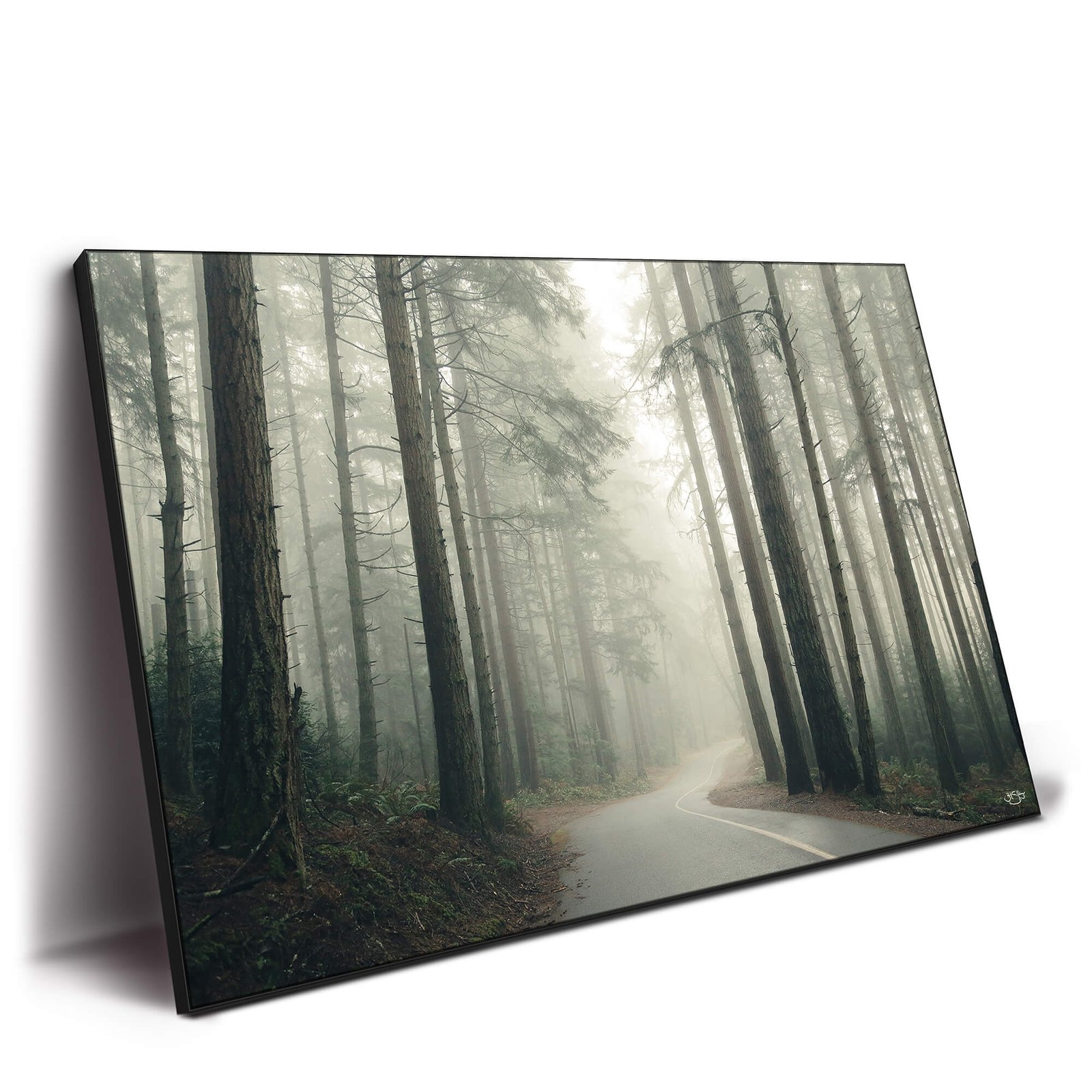A winding road vanishes into a misty forest, enveloped by tall, majestic trees that create a sense of serenity and mystery. Soft light filters through the foliage, enhancing the tranquil atmosphere of this forest scene.
