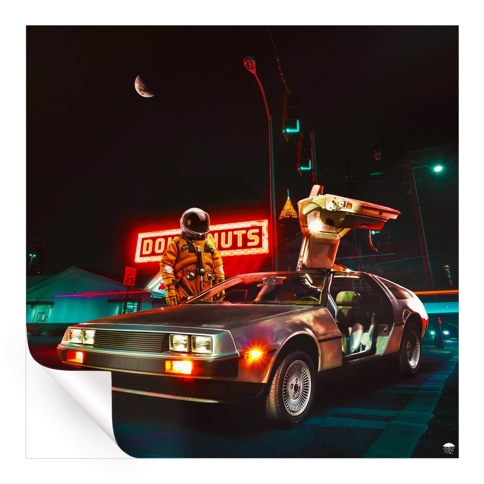 A figure clad in an orange space suit with a reflective visor stands beside a iconic car. The scene is set under a night sky, illuminated by the glow of a neon sign spelling “DONUTS” in bold letters.