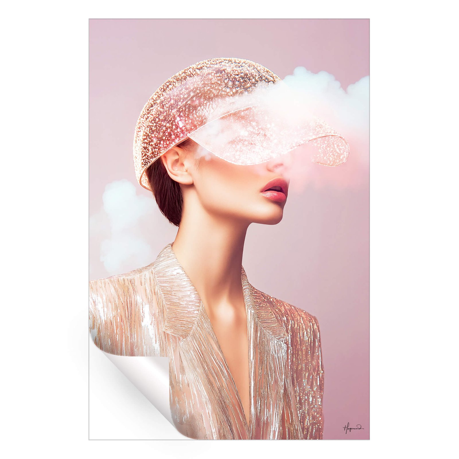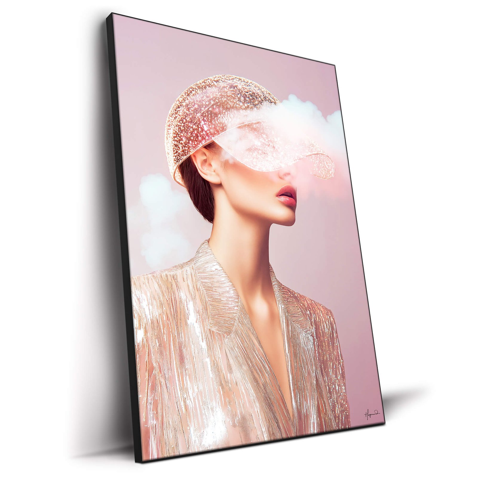 Hazy vapor drifts behind her shoulders, adding depth to the minimalist setting. The portrait balances edgy fashion with serene poise, pairing contemporary elegance with indie flair. Choose this large fashion wall art or explore similar contemporary artwork prints to build a cohesive gallery. Calm pink tones blend smoothly into feminine spaces, making it an ideal female portrait wall art for sophisticated décor.