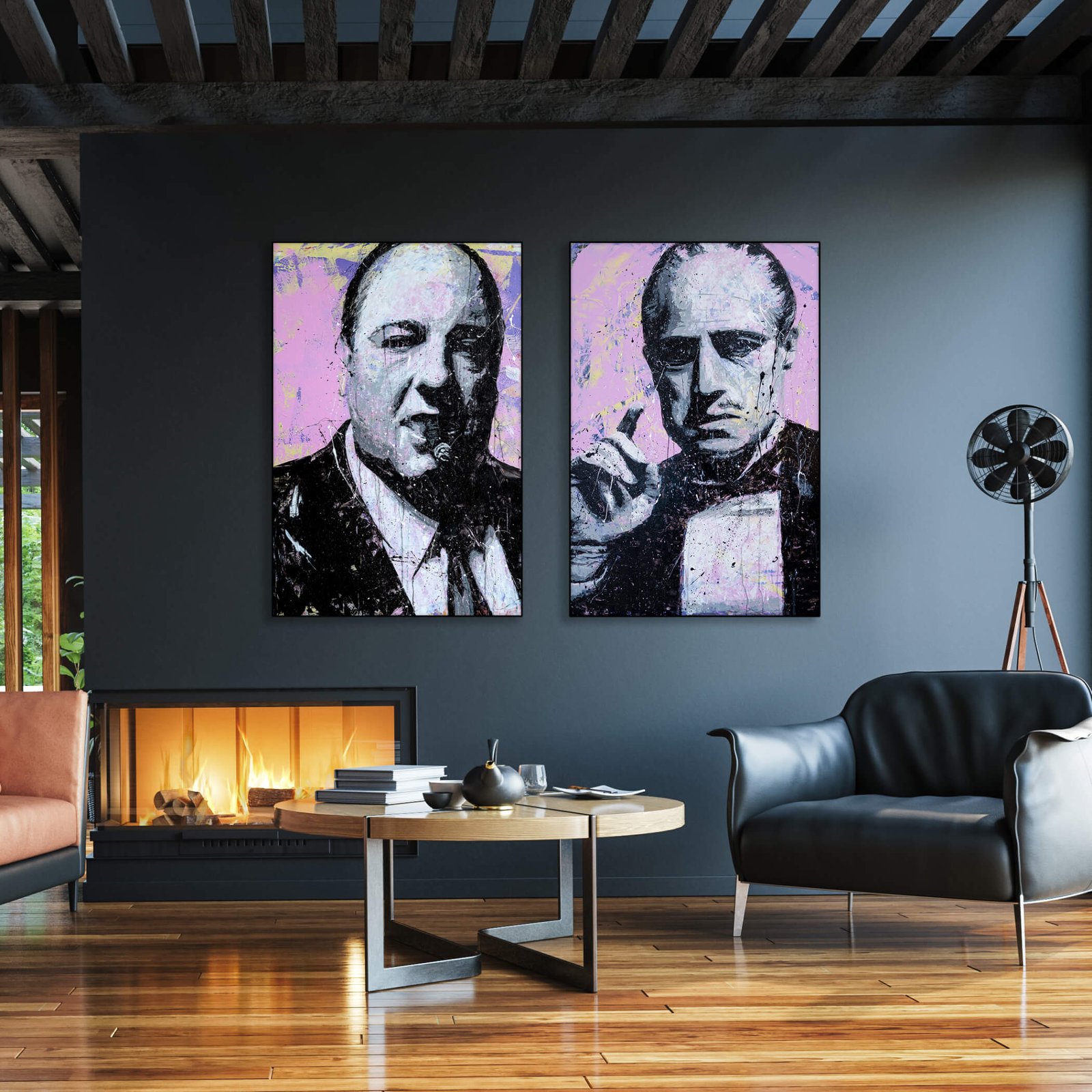 The Godfather emerges from a canvas of contrasting energies, his solemn visage and iconic hand gesture a silent testament to power and contemplation. Amid a backdrop of soft purples and stark whites, the figure is both commanding and intimate, painted with bold, expressive strokes.
