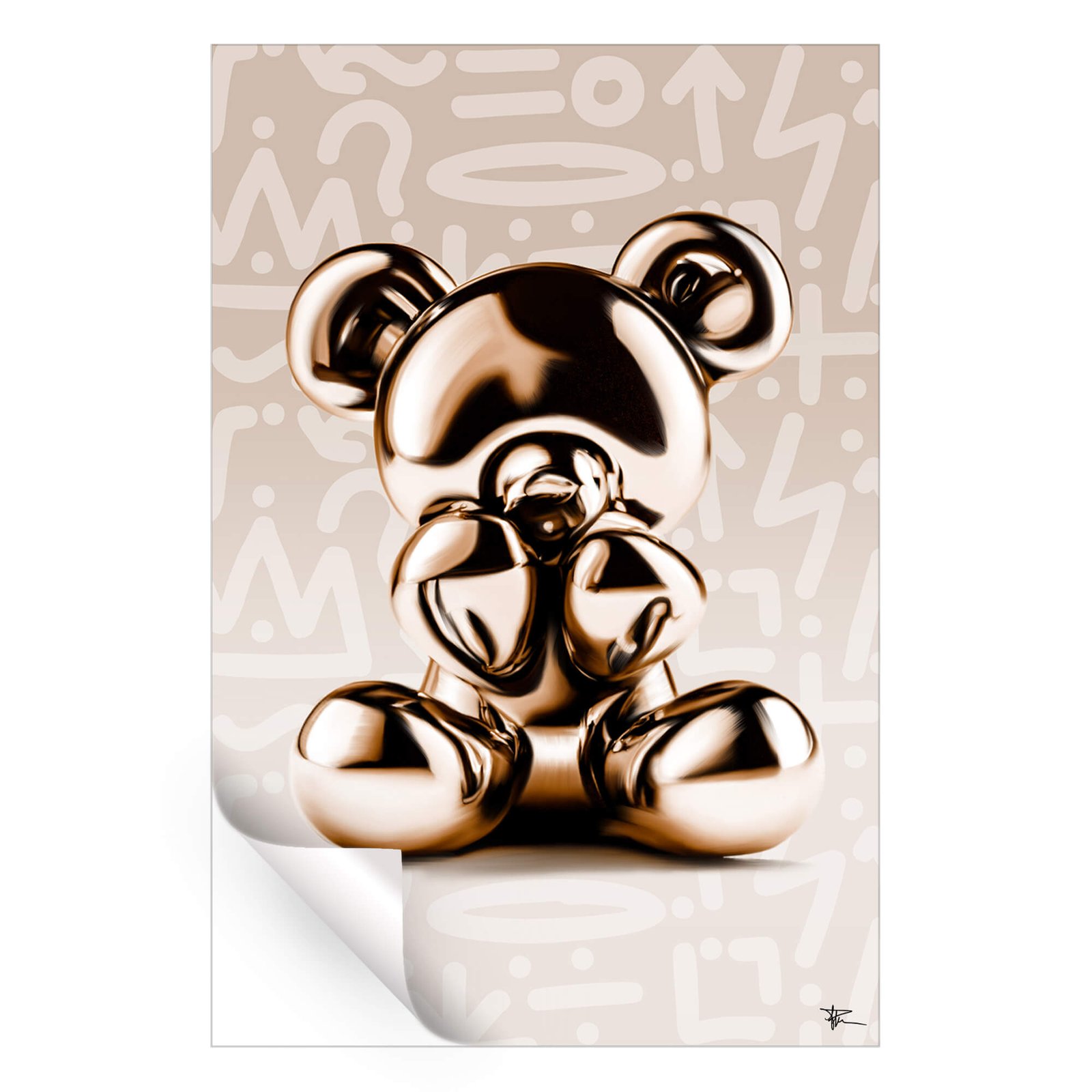 A shiny gold bear sculpture sits proudly in the foreground, with its metallic finish reflecting light in a way that highlights its smooth, rounded form. The playful bear contrasts against a graffiti-style background, featuring abstract, faint, and almost geometric patterns in a muted cream color. The bold combination of the polished gold surface and the street-art-inspired backdrop brings a sense of whimsicalness to the piece while maintaining an air of sophistication.