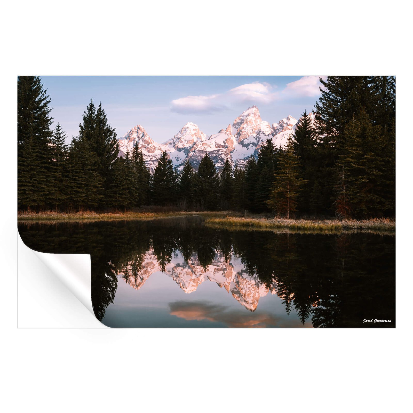 A serene view of the Grand Tetons photographed by Jared Gunderson, where the twilight sky meets the snow-capped splendor of the mountains.