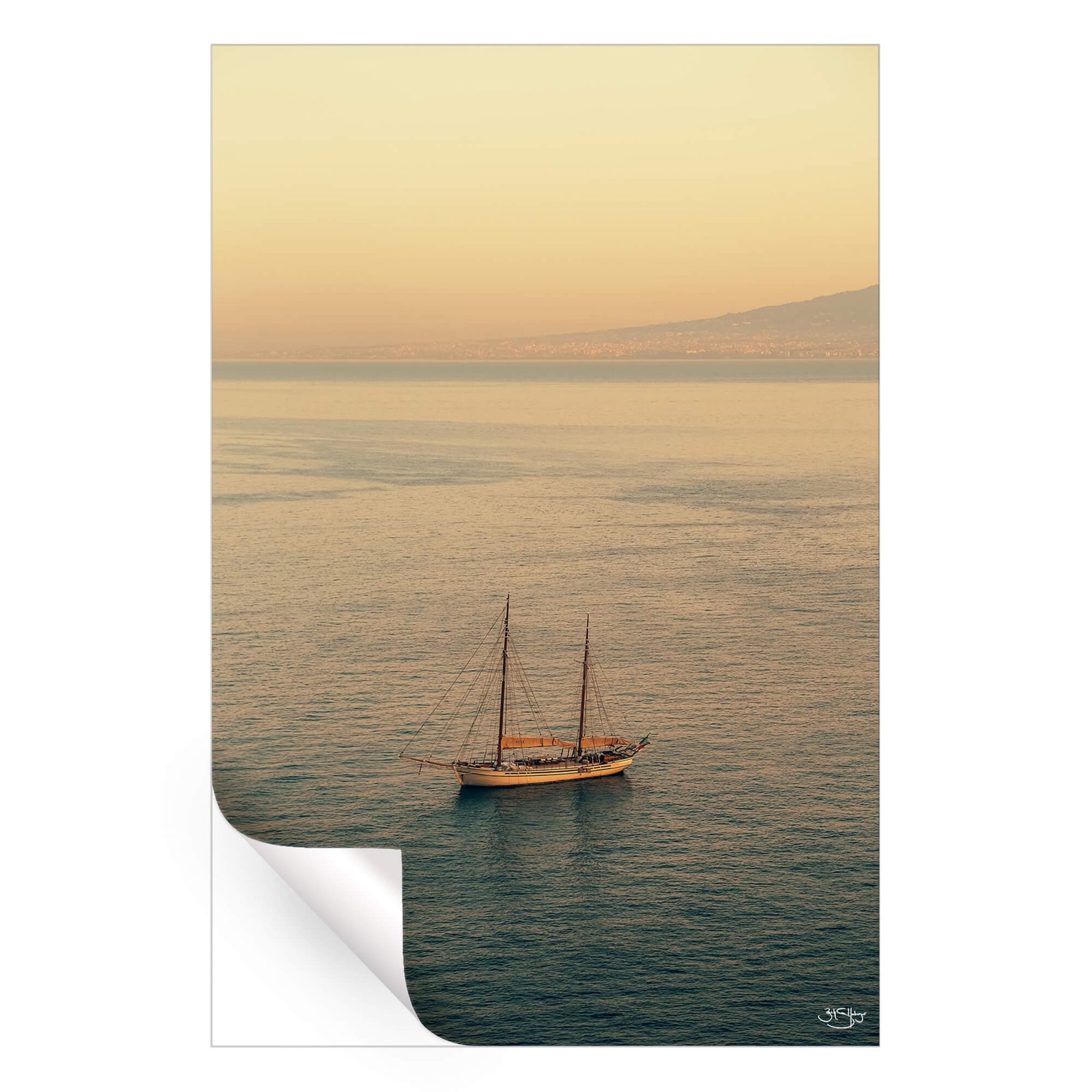 A picturesque sailing boat drifts peacefully on calm waters as the sun sets over the horizon, casting a warm golden glow across the scene. The serene atmosphere invites viewers to imagine a tranquil evening by the sea, where the beauty of nature reigns.