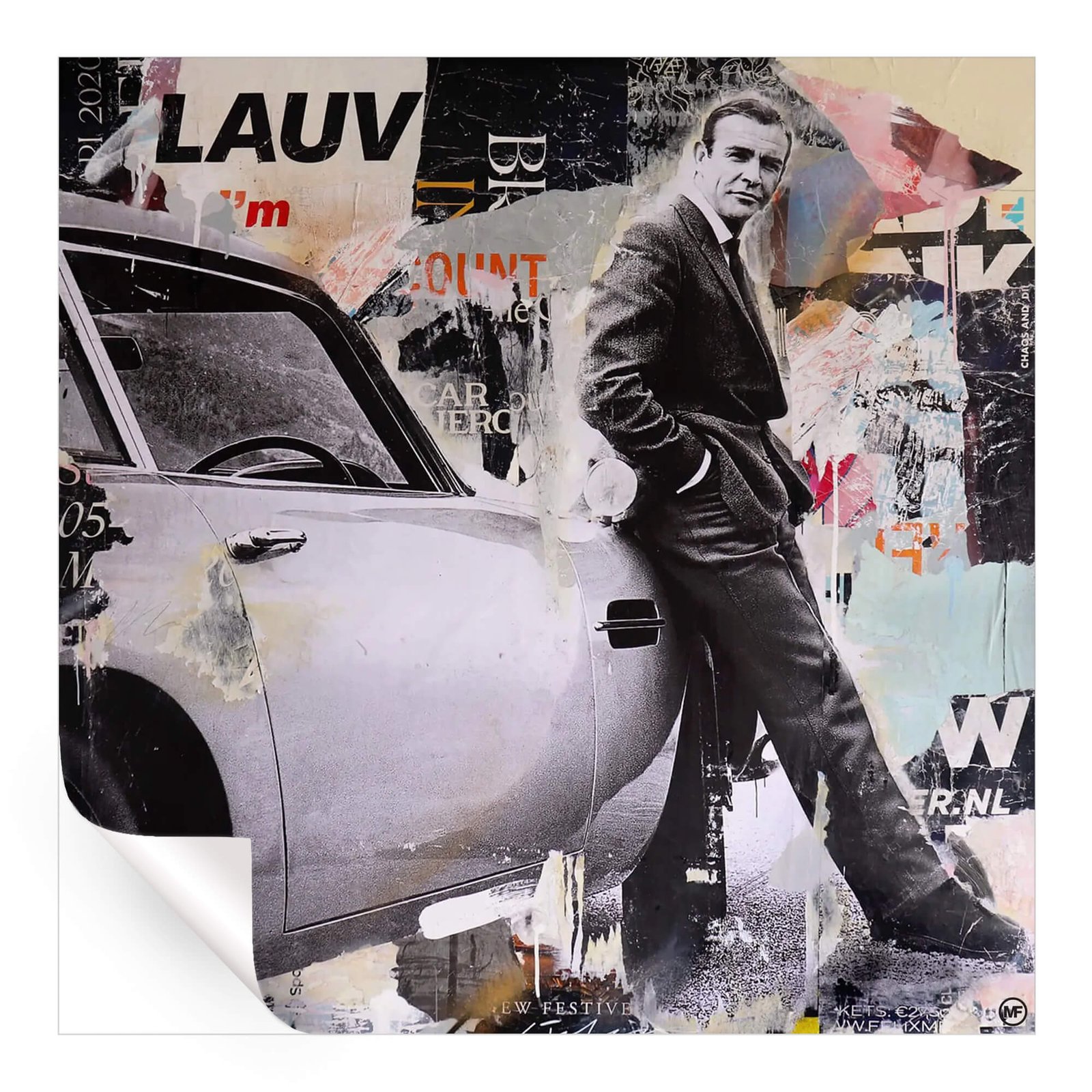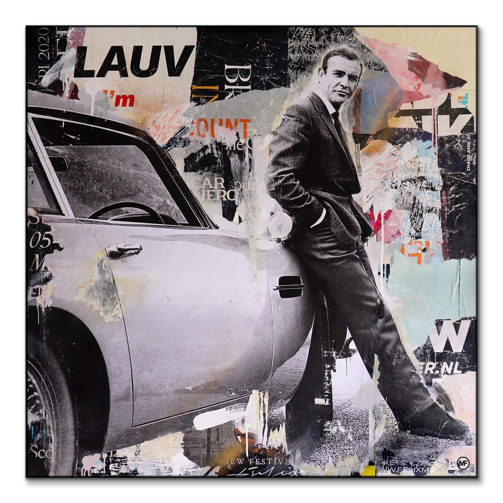 The iconic figure, reminiscent of the legendary Sean Connery’s portrayal, leans confidently against a classic car, exuding the timeless charm and cool demeanor of the beloved secret agent. Splattered with a dynamic array of abstract elements and urban graffiti, the piece captures the essence of Bond’s allure against the backdrop of a fast-paced and ever-changing world.