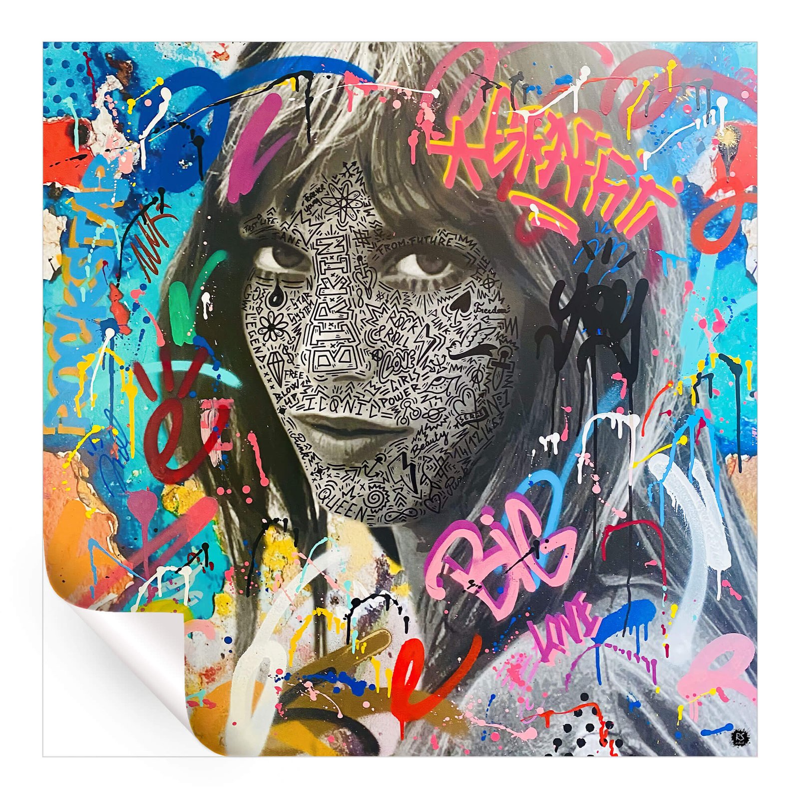 Jane Birkin, an emblem of 1960s style and sophistication, is re-imagined through the lens of contemporary graffiti.