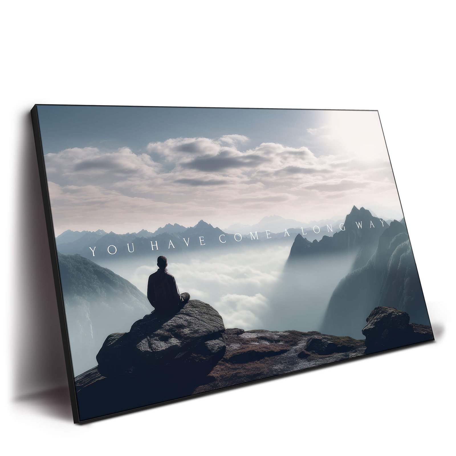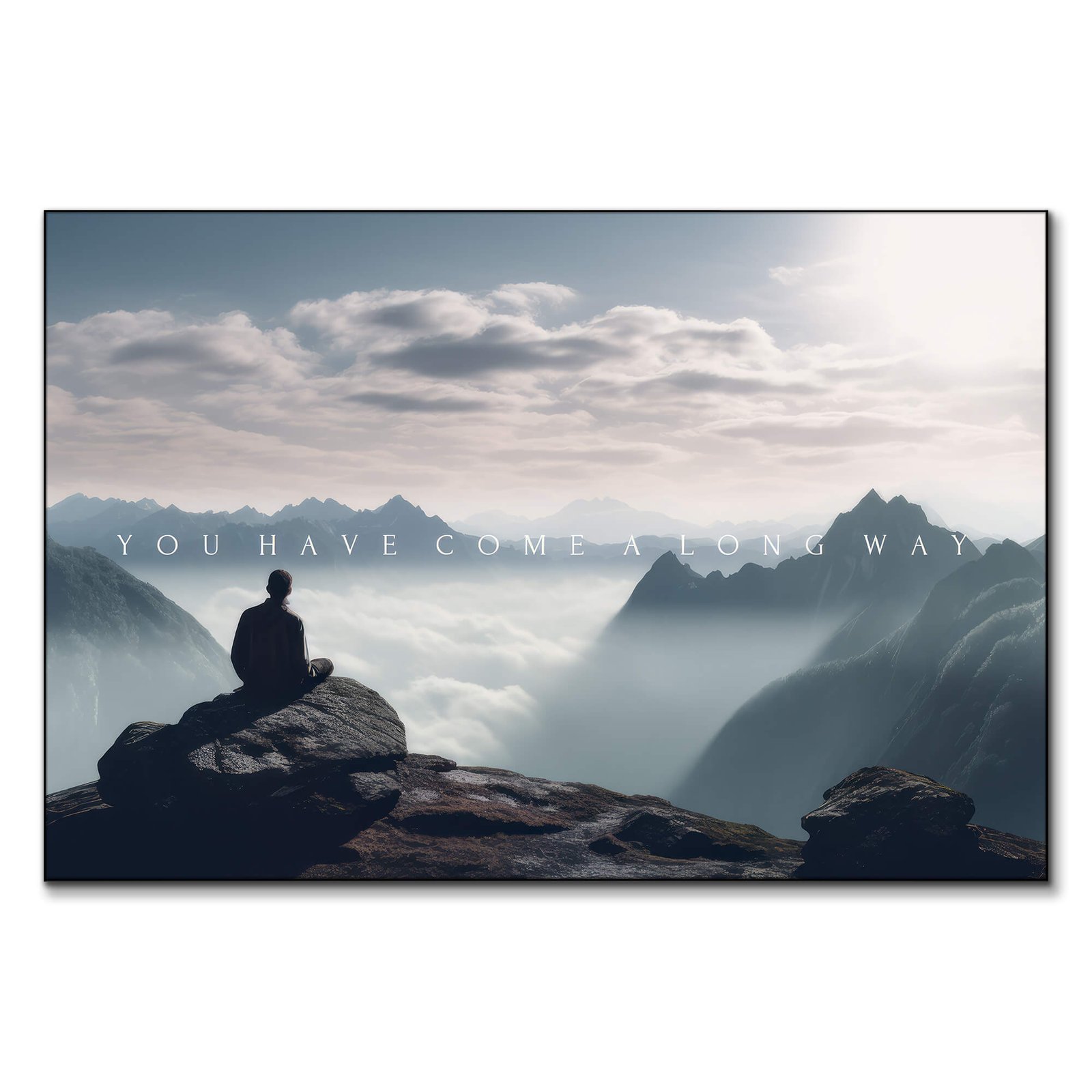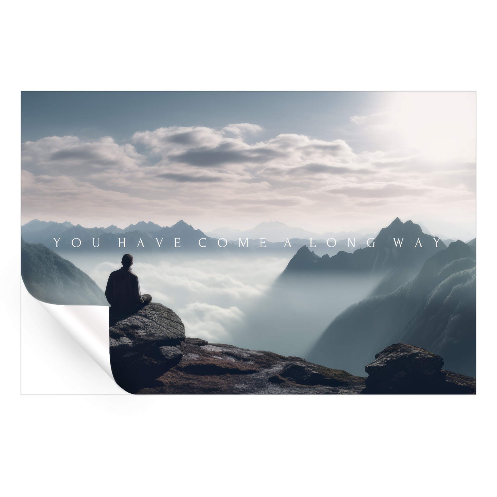 A tranquil and inspiring scene, this artwork captures a lone figure gazing over mist-covered peaks, reflecting on the journey behind them. The soft glow of sunlight filtering through the clouds enhances the serene atmosphere, evoking a sense of peace and accomplishment. Layered mountain ridges fade into the distance, creating depth and a dreamlike quality. This piece serves as a powerful reminder of perseverance and personal growth.
