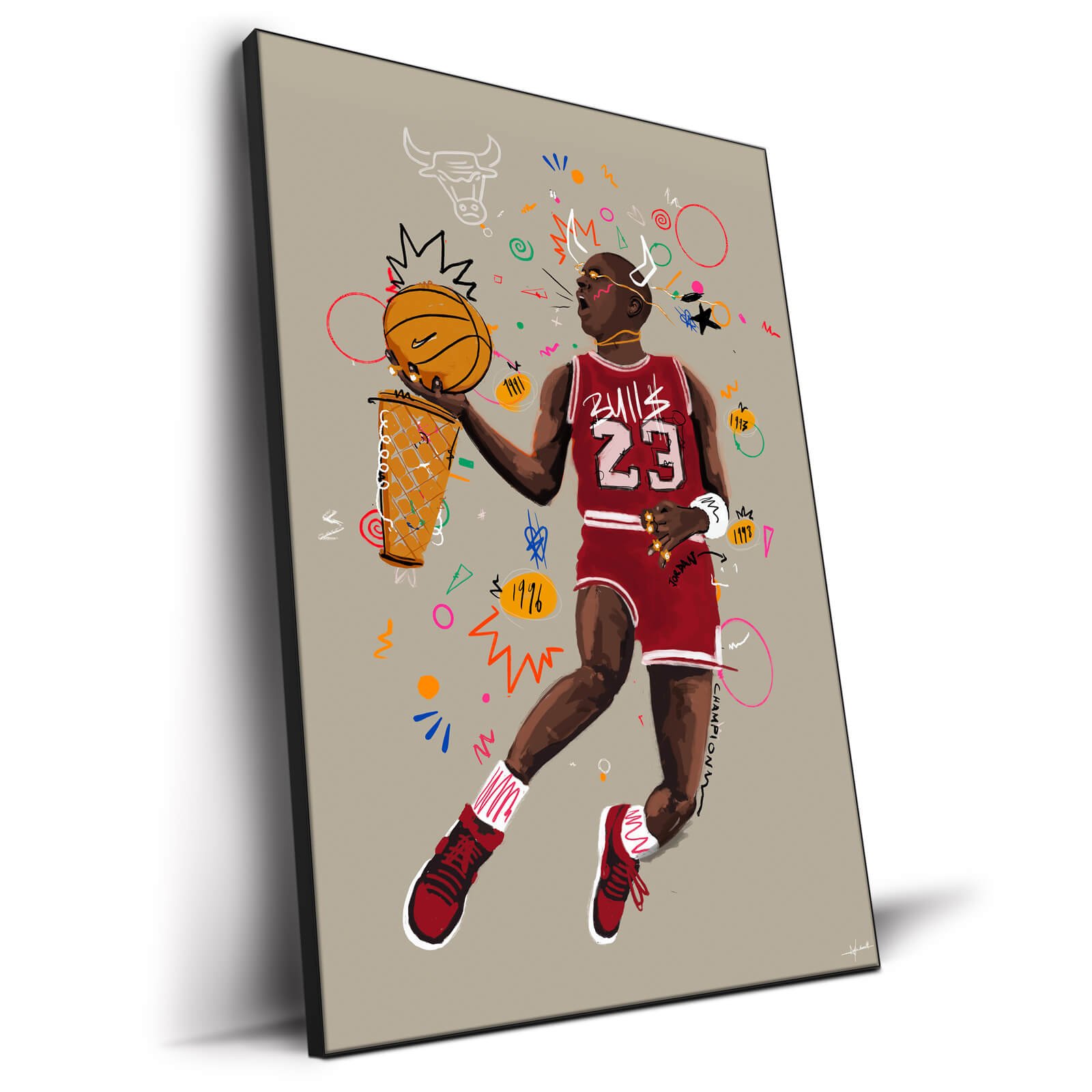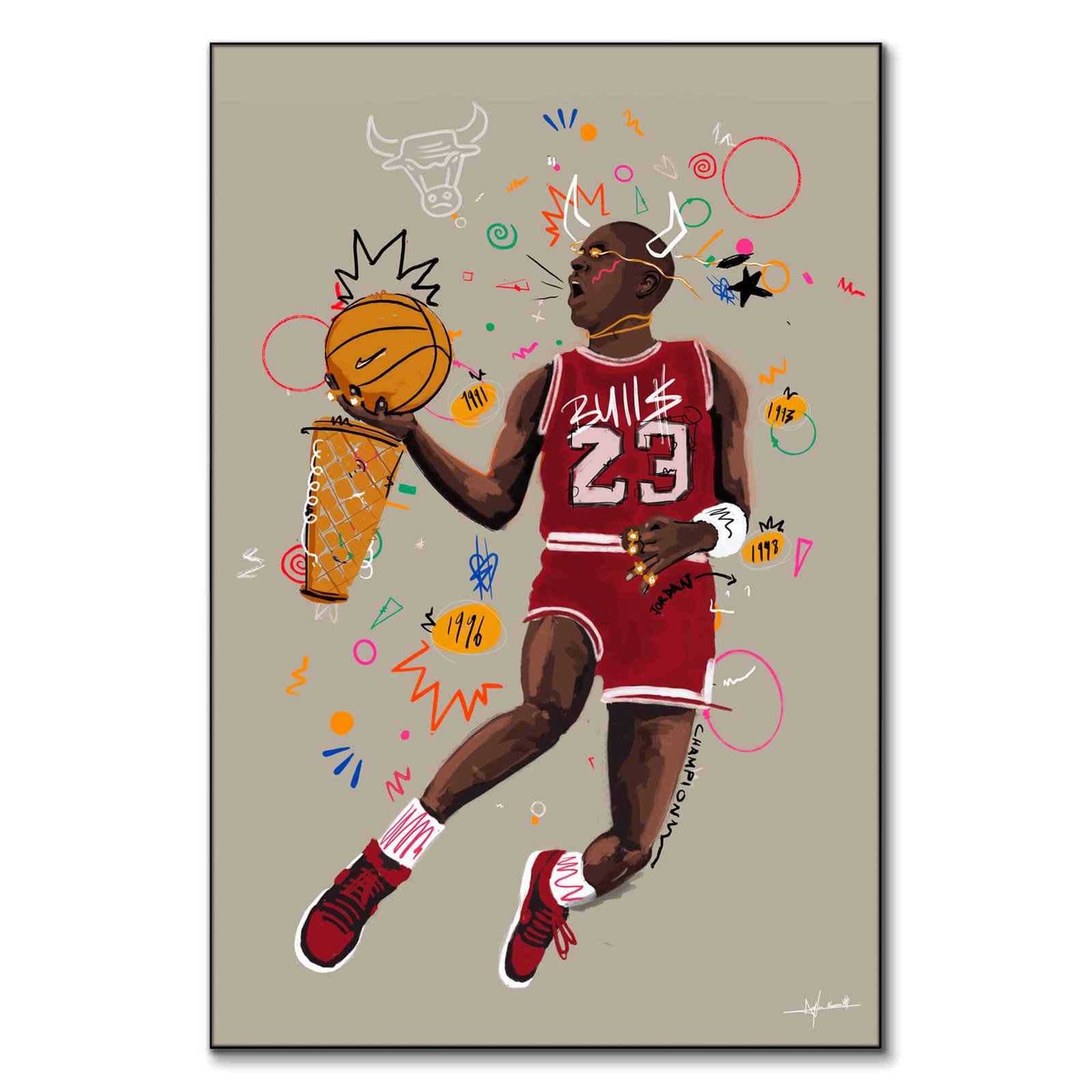 His legendary form is set against a taupe backdrop peppered with vibrant, abstract designs and basketball motifs, emphasizing his dynamic athleticism and the energy of the sport.