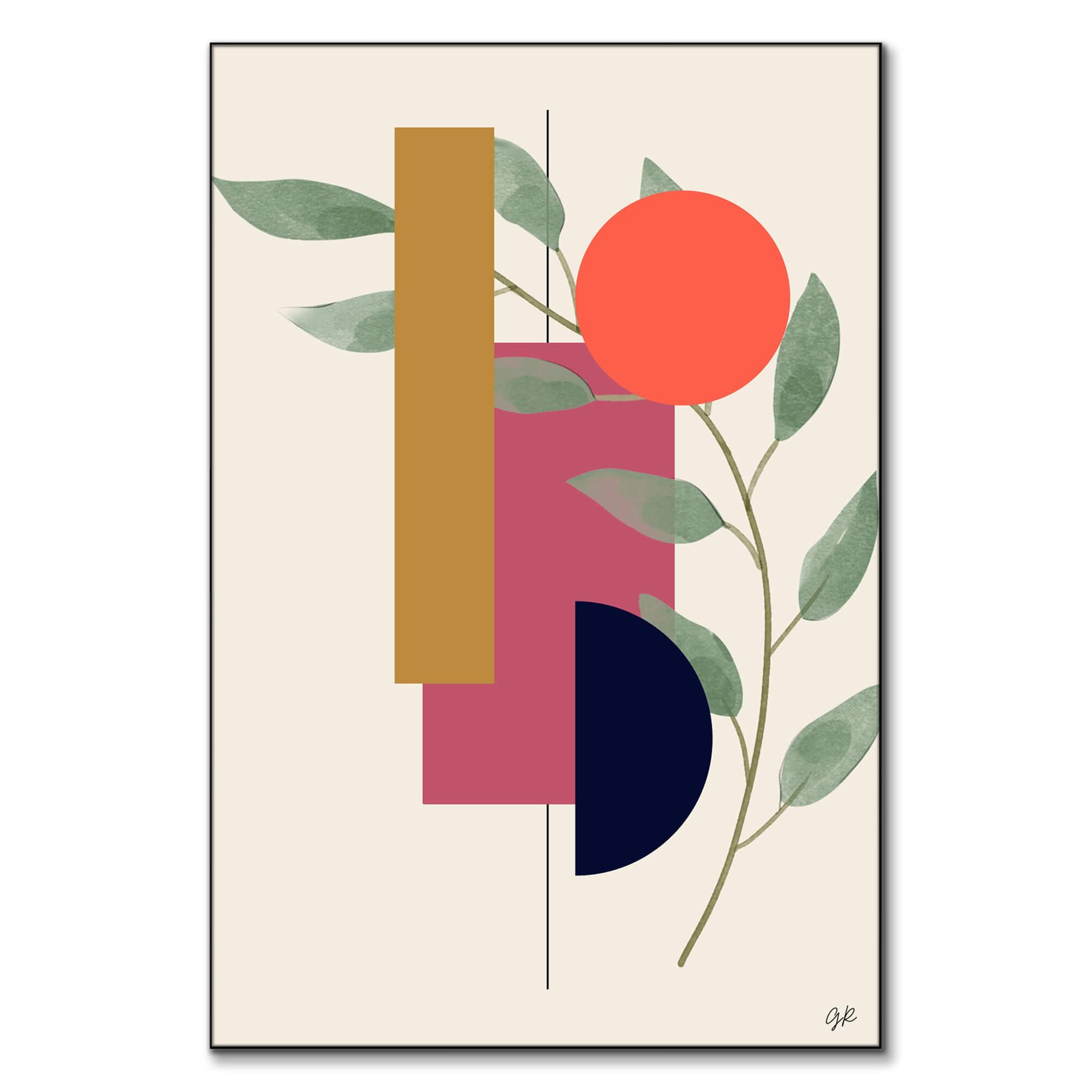 Geometric shapes and a hint of nature come together in an abstract representation. A solid brown rectangle stands alongside a pink square, partially intersecting in a moment of simple overlap. Below, a navy blue half-circle grounds the arrangement, while a sprig with pale green leaves introduces an organic element, adding a natural contrast to the straight lines and sharp corners. Overhead, a red-orange circle hangs, suggesting a sun in a broad, open sky, balancing the minimalist composition.