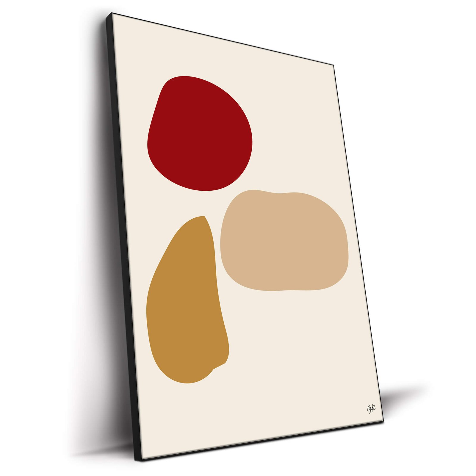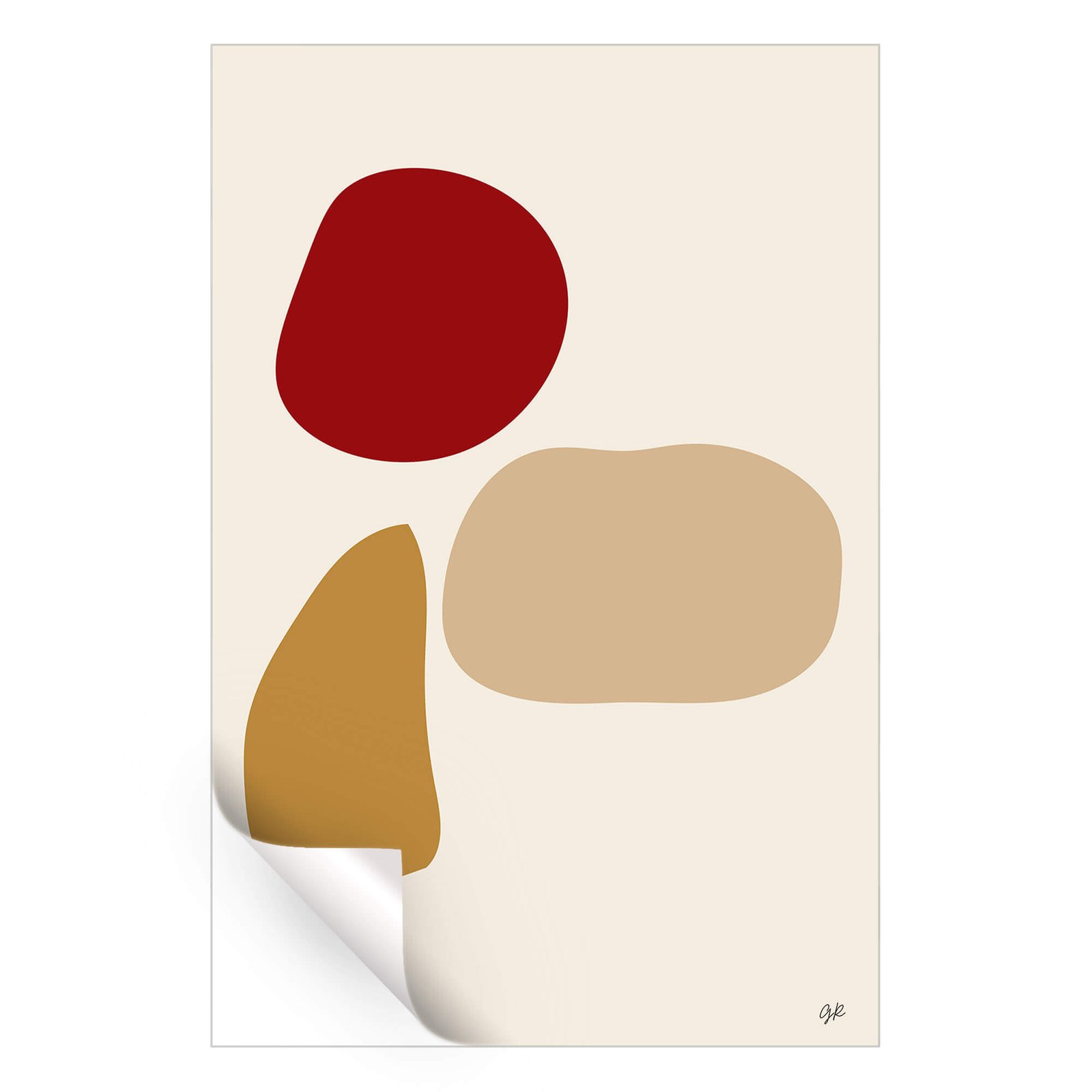 Bold and unadorned, three organic shapes gather. A robust red form looms at the top, full and rich. Beside it, a gentle beige oval stretches out, a quiet contrast in both color and contour. Anchoring the trio, a golden brown figure, like a shard from the earth, claims its place with an understated warmth.