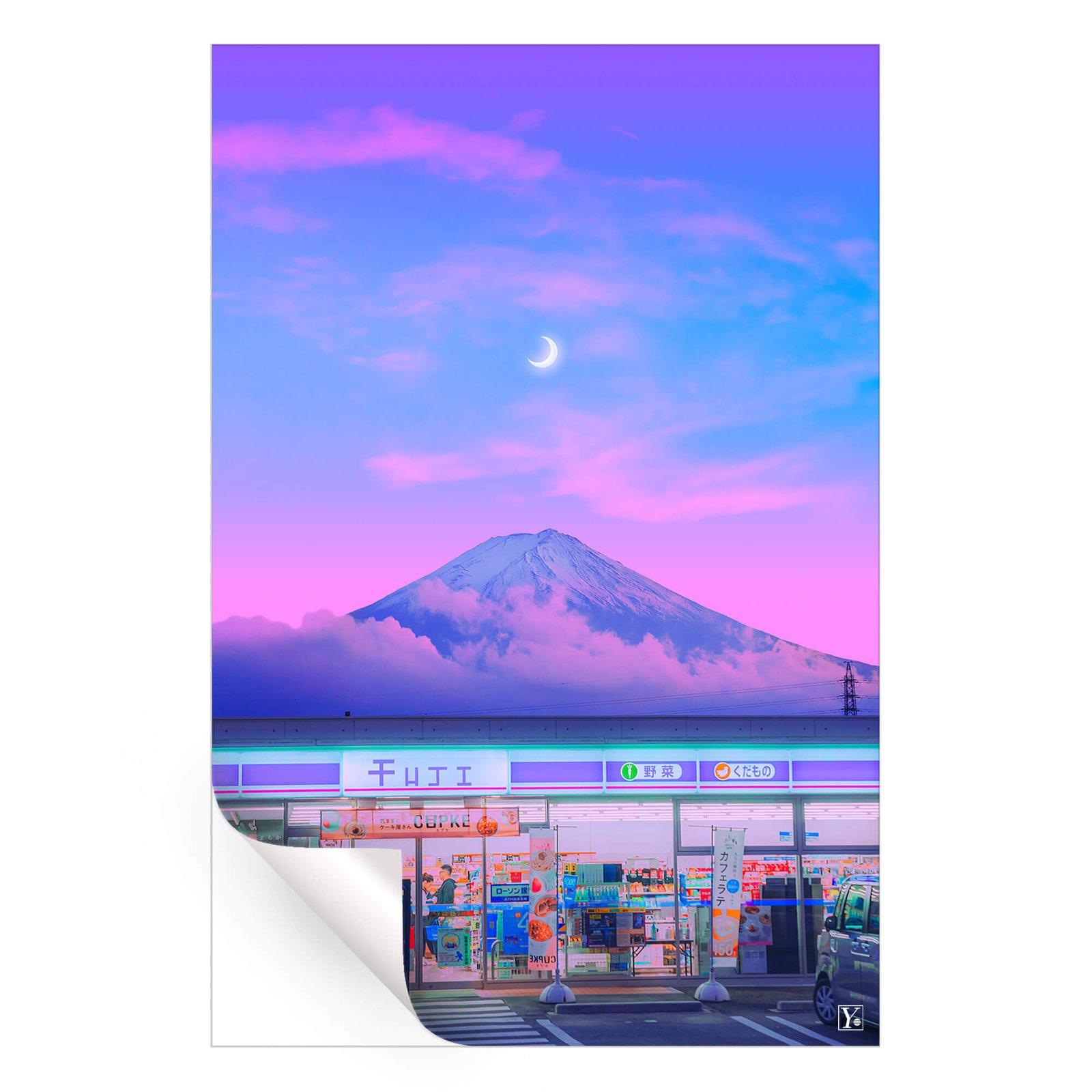 Below, the everyday life continues as a convenience store brightly illuminates, offering a bold, yet harmonious contrast to the natural splendor above.