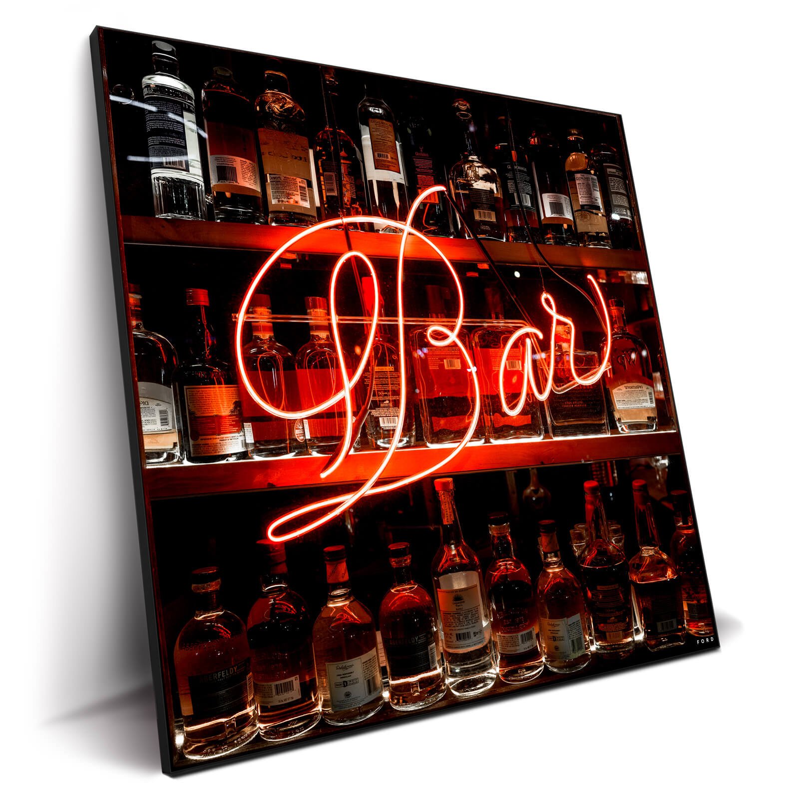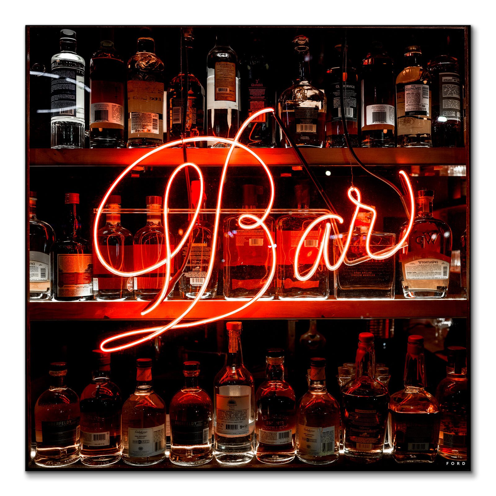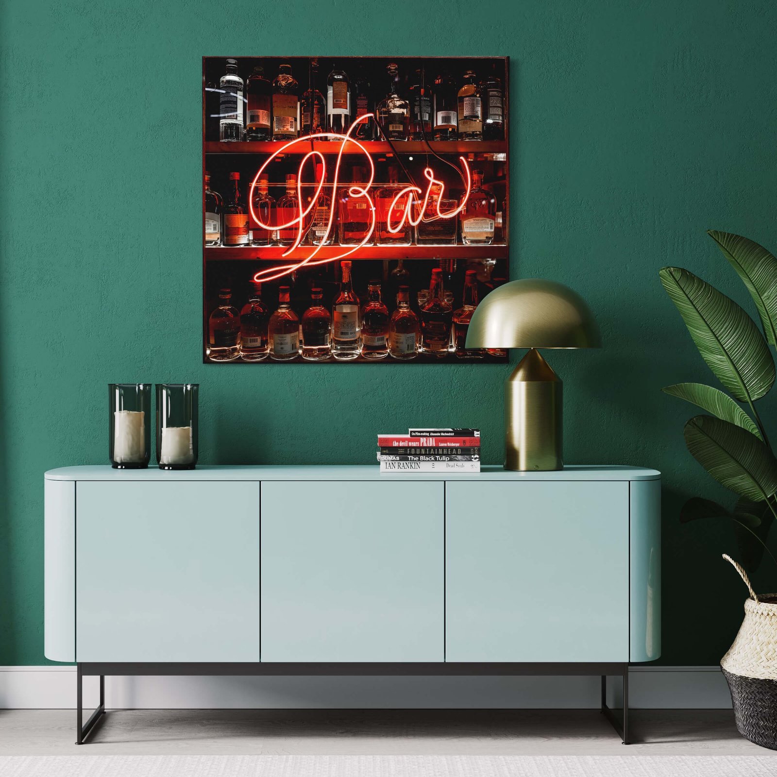 Several rows of liquor bottles are displayed on shelves behind the glass window with a neon sign spelling “Bar” in cursive as the focal point. The red neon glow creates a warm, inviting atmosphere and reflects off the glass surfaces. The arrangement and lighting in this neon bar sign photography gives the setting a classic, cozy bar feel.
