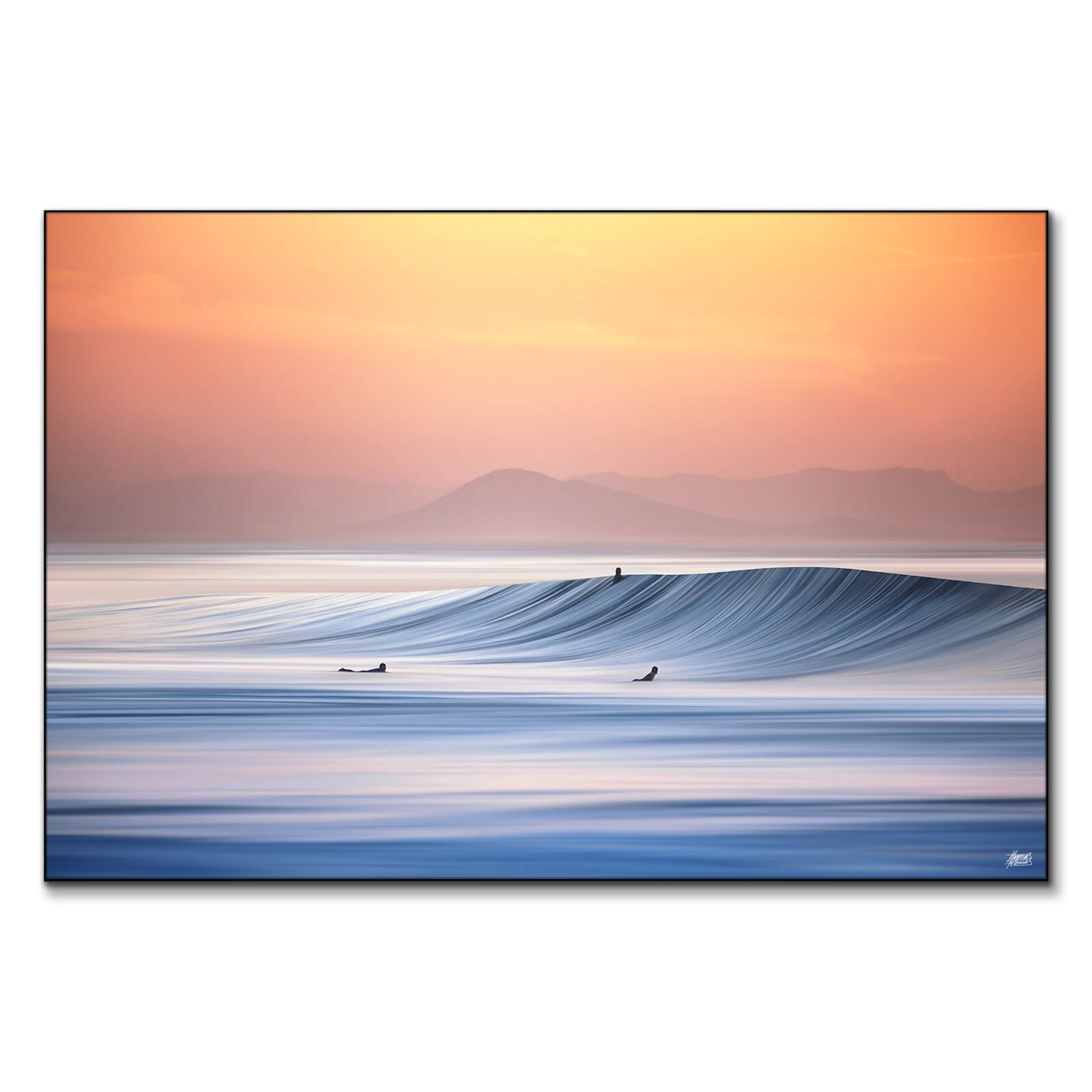 Rolling fog floats over distant hills while the last rays of sunset paint the sky in gentle peach and orange. The sea below turns to liquid silk. A single perfect wave rises, its crest smooth and blue like brushed steel. Three tiny surfers drift nearby, their silhouettes adding scale and quiet anticipation. Long shutter motion blur softens the water, merging shoreline and horizon into weightless stripes of color. Misty mountains fade into lavender, hinting at land yet keeping the focus on the open ocean. Everything feels still and euphoric. Each band of light and shade runs parallel, emphasizing the artwork’s horizontal layout and inviting the eye to wander. This beach wall art balances movement and calm.