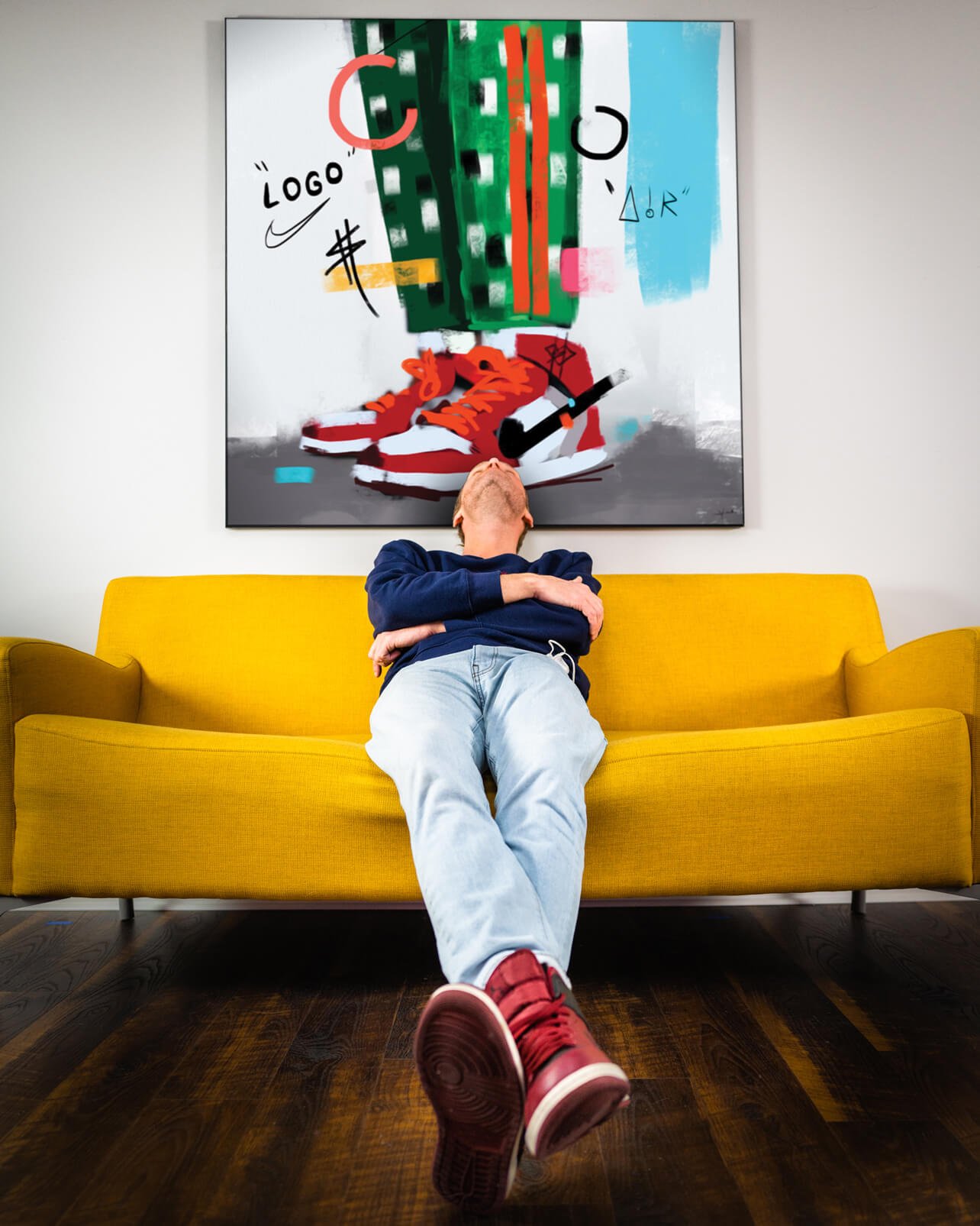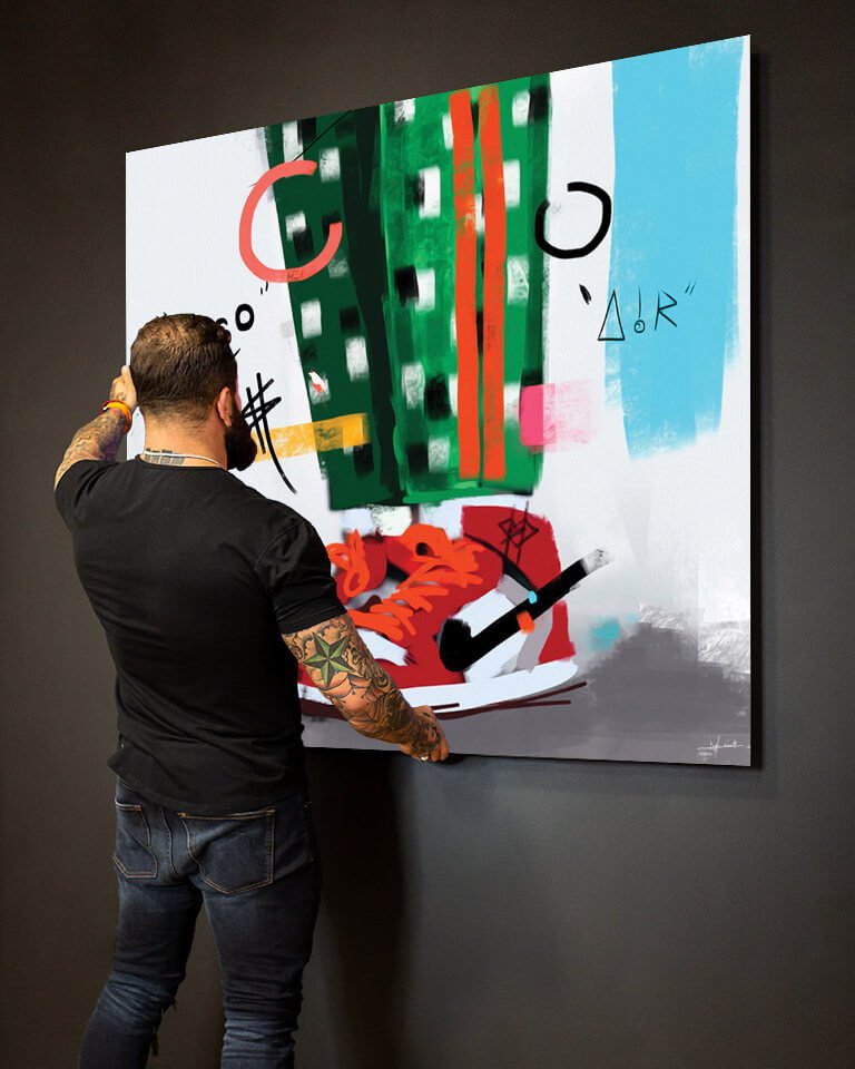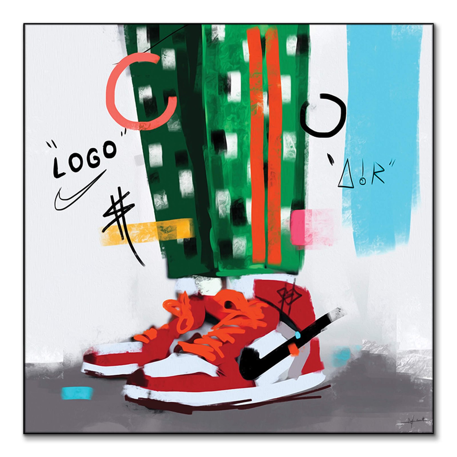 Nuwarhol twists pop icons with a designer’s eye, fusing illustration and art direction into rebellious statements. See more from the artist in the Nuwarhol collection of artwork where luxury branding meets street tags in bold prints. His background in commercial design explains the crisp typography and fast strokes that reference billboard layouts. The spotlight on kicks, tags and color blocking keeps the piece aligned with his love for lifestyle and fashion narratives.