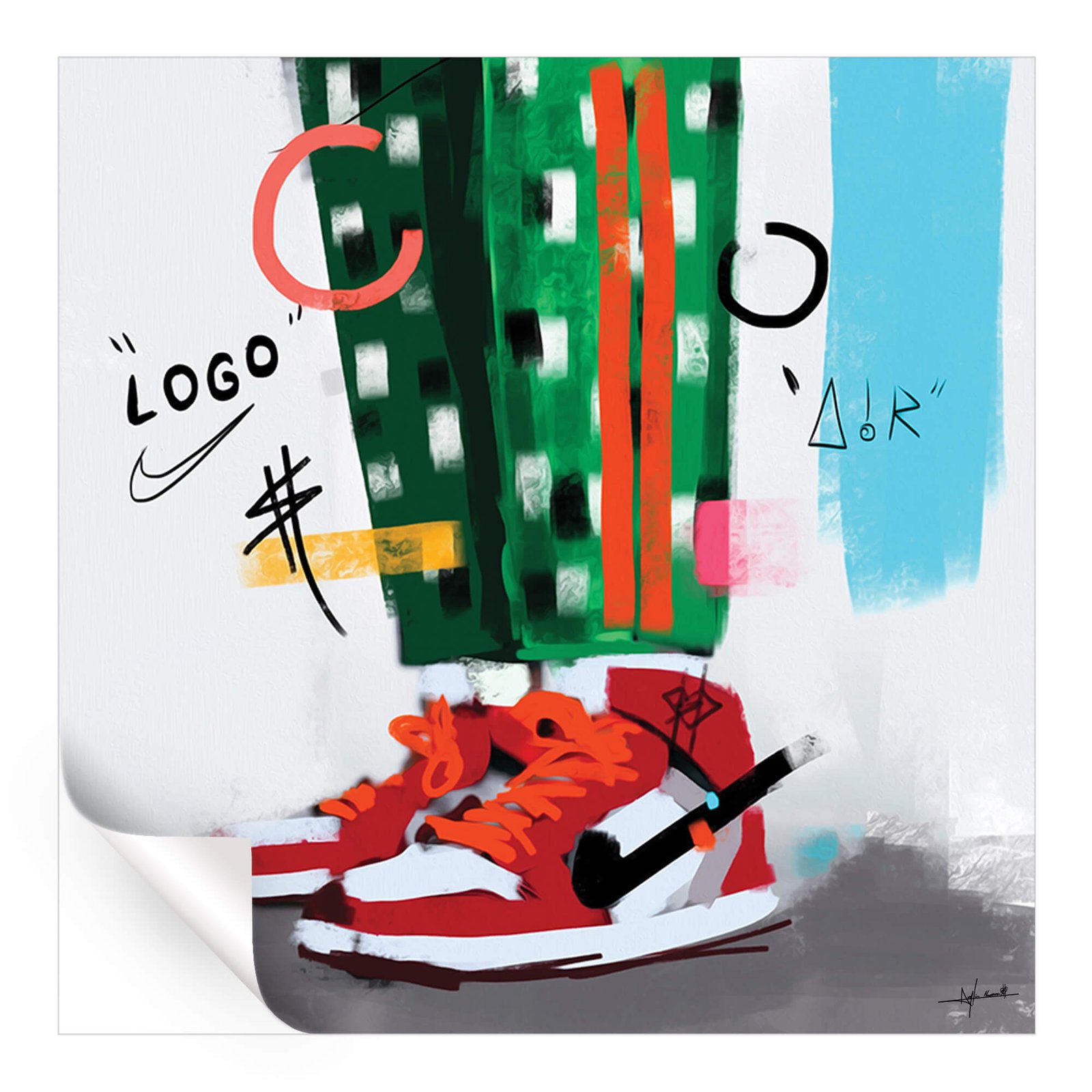 Thick green blocks cascade down loose pants while vivid orange stripes race through the pattern. A pair of red and white sneakers, laced in electric orange, anchors the scene, their shadows brushed in quick gray strokes. Hand-drawn circles, triangles and the word “LOGO” float like alley tags, nodding to street marketing and luxury collabs. Turquoise and blush paint swatches bleed into the white background, adding fresh pops of color. The squared composition feels like a snapshot of a curbside moment – part graffiti style wall art, part runway tease. Every rough edge and overspray mark celebrates the DIY hustle of hip hop culture. Hints of Nike swooshes and OFF-WHITE lettering wink at high-fashion sneaker fever. The palette mixes cool aqua, hot red and urban asphalt gray, creating kinetic contrast. Viewers can almost hear subway brakes screeching beneath the stride.
