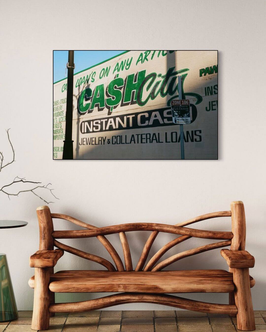 This photograph captures a vintage painted billboard on a brick wall, advertising a cash and loan service. The rich textures and warm tones of the brick juxtapose the faded green and white of the sign, evoking a sense of nostalgia.