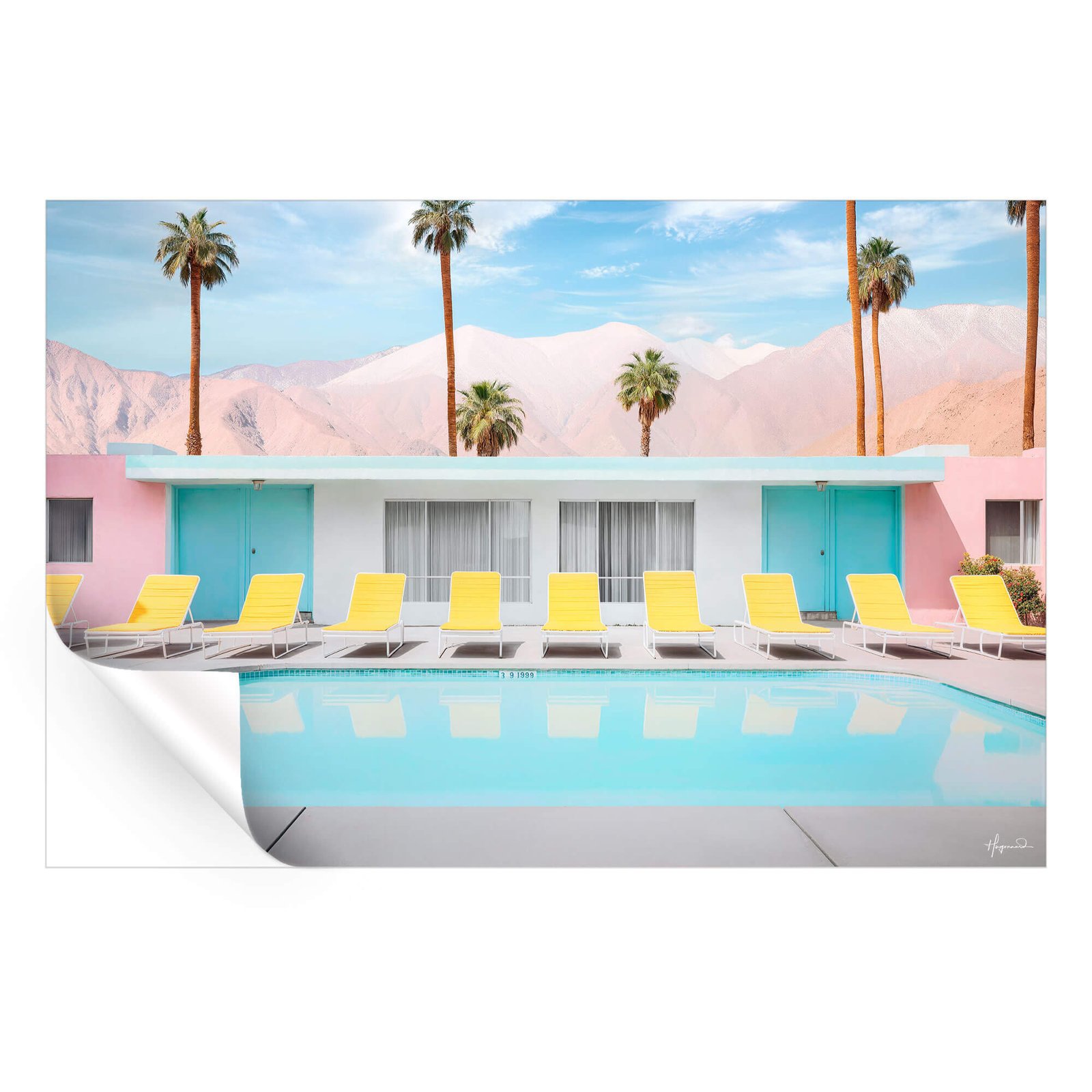 Soft pink mountains rise behind a classic mid-century motel. A row of bright yellow loungers lines the shimmering pool, reflected in water that shifts from aquamarine to sky blue. Turquoise doors and white curtains anchor the scene while slender palms punctuate the horizon. Light clouds drift across a pastel sky, almost blending with the pale desert peaks. Every line feels crisp, every color feels sun-kissed, inviting an endless summer state of mind.