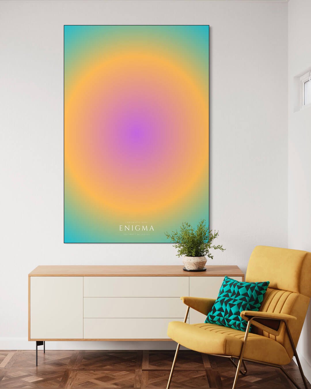 This piece sits at the intersection of large abstract wall art, modern geometric wall art, and psychedelic art prints. Its soothing yet vivid palette uplifts living rooms, bedrooms, studios, or meditation corners without competing with furniture. The absence of figurative detail lets surrounding décor accents shine while the color field anchors the space. Other works in these categories explore similar color play, perfect for curating a cohesive gallery wall.
