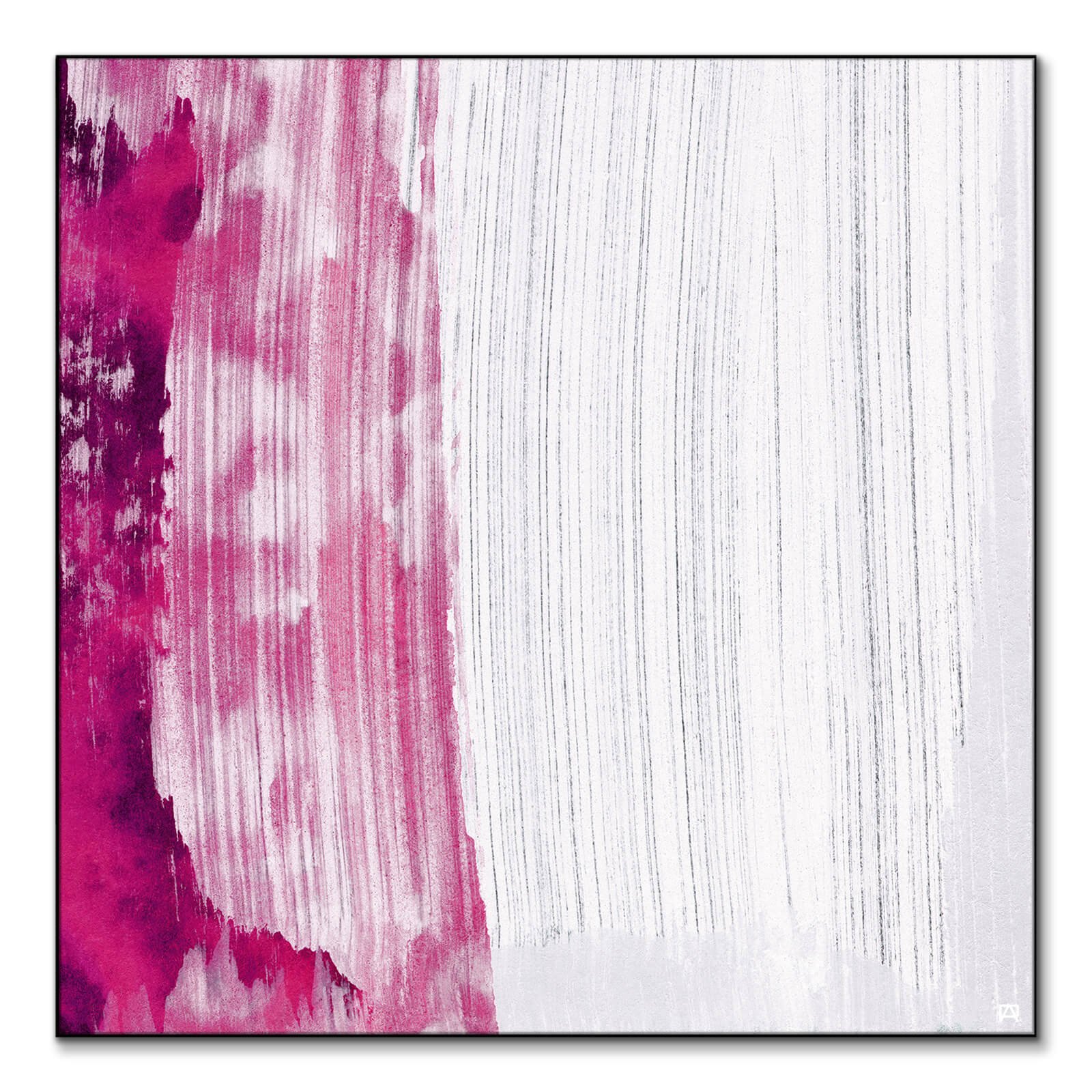 Vivid shades of magenta bleed into the composition, contrasting with the stark white that dominates the rest of the space.