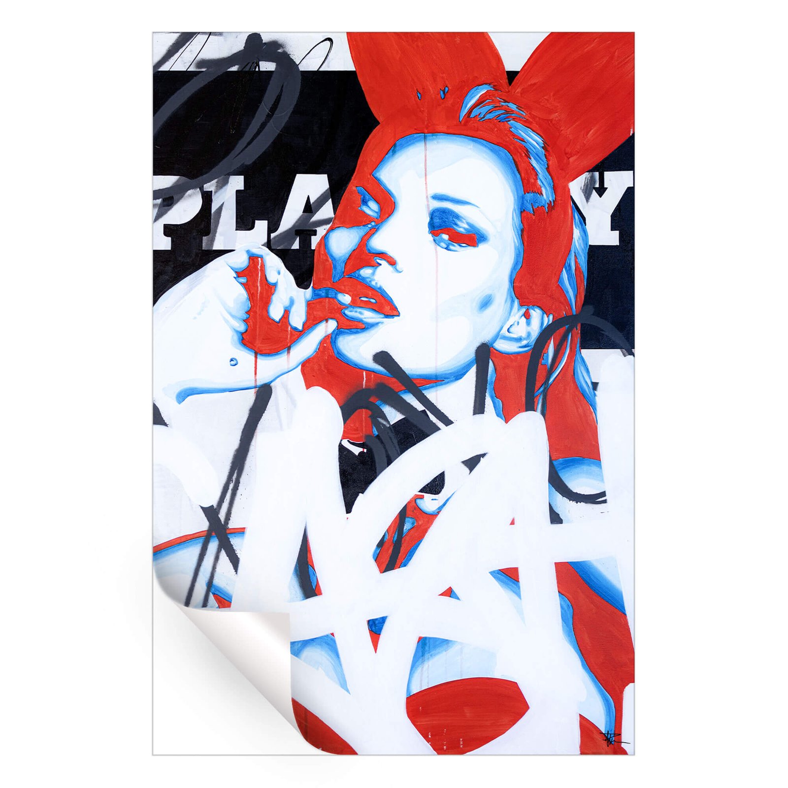 In P Muir Art’s provocative portrayal, the iconic Playboy bunny is reimagined against a backdrop of urban chaos, its vivid reds and blues clashing with bold black and white graphics. The subject’s face, fragmented by sharp lines and dripping paint, suggests a deeper narrative beyond the gloss of the magazine’s surface.
