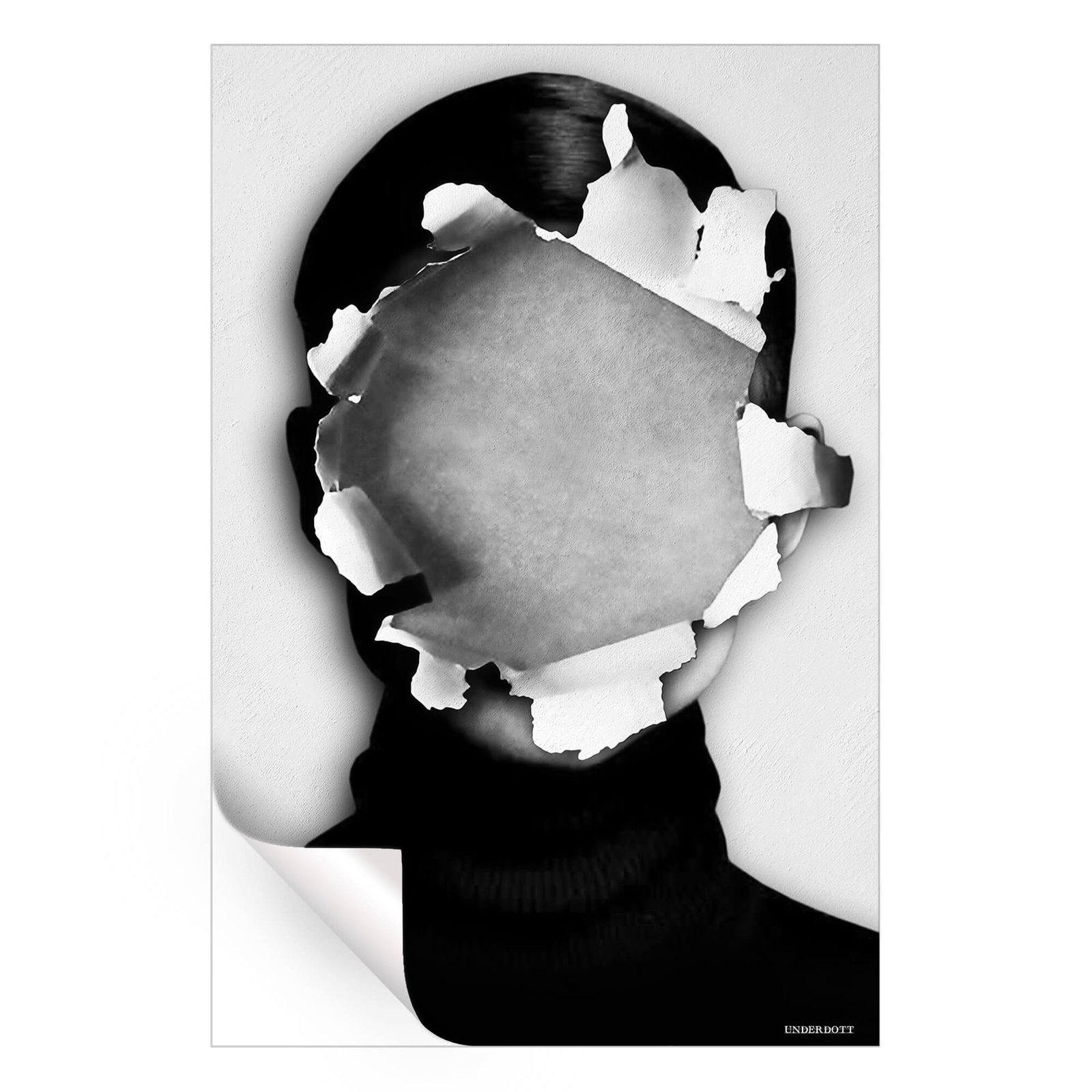 A lone figure stands against a pale wall, hair slicked back, neck wrapped in a dark turtleneck. Light grazes the crown of the head while shadows pool around the collar, intensifying the vertical format. The face is gone, replaced by a jagged hexagon of torn paper that curls forward like peeling bark. Each ripped flap casts soft gray shadows, turning emptiness into texture.
