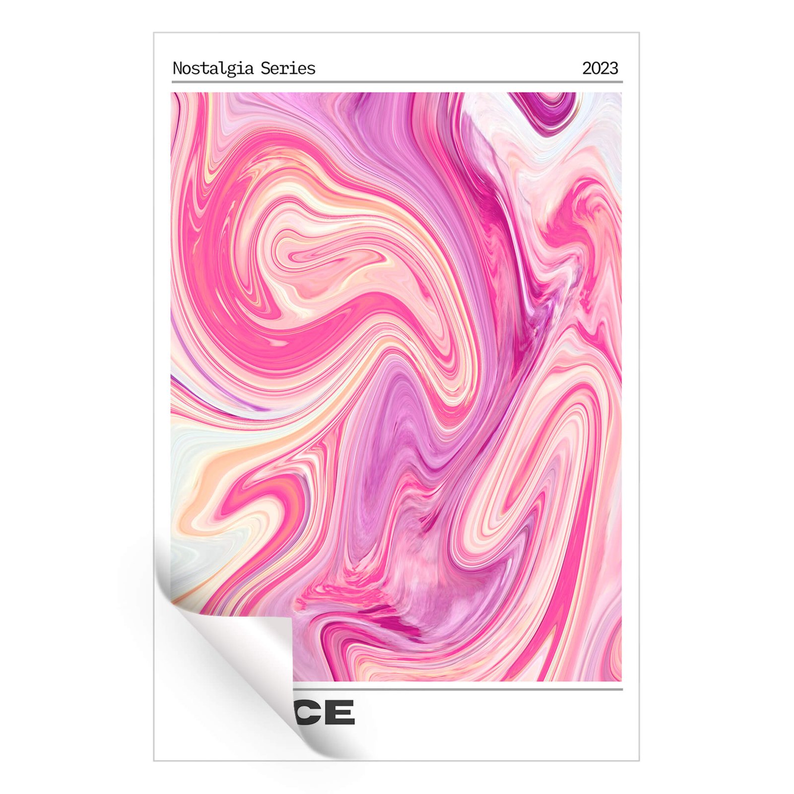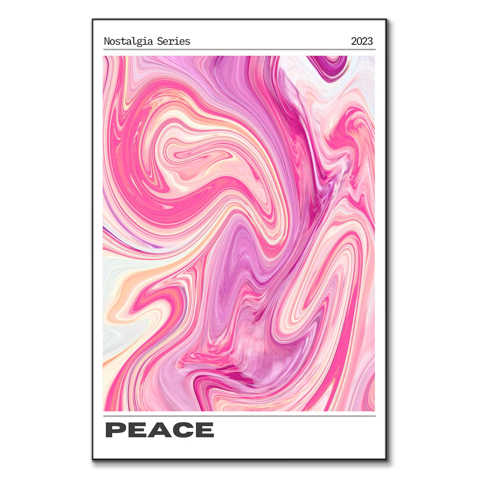 Soft rose, fuchsia, and lavender pigments twist like liquid marble, creating silky ribbons that ripple from corner to corner. Subtle sherbet oranges peek through the folds, adding gentle warmth to the pink spectrum. The fluid motion feels endless, as if the colors are caught in a slow-moving vortex. Thin ivory veils lighten the center, giving the eye places to rest. A crisp white border carries the typeface words Nostalgia Series 2023, grounding the swirling field in time. The lower edge spells PEACE in charcoal gray, balancing the lively palette with a quiet statement.