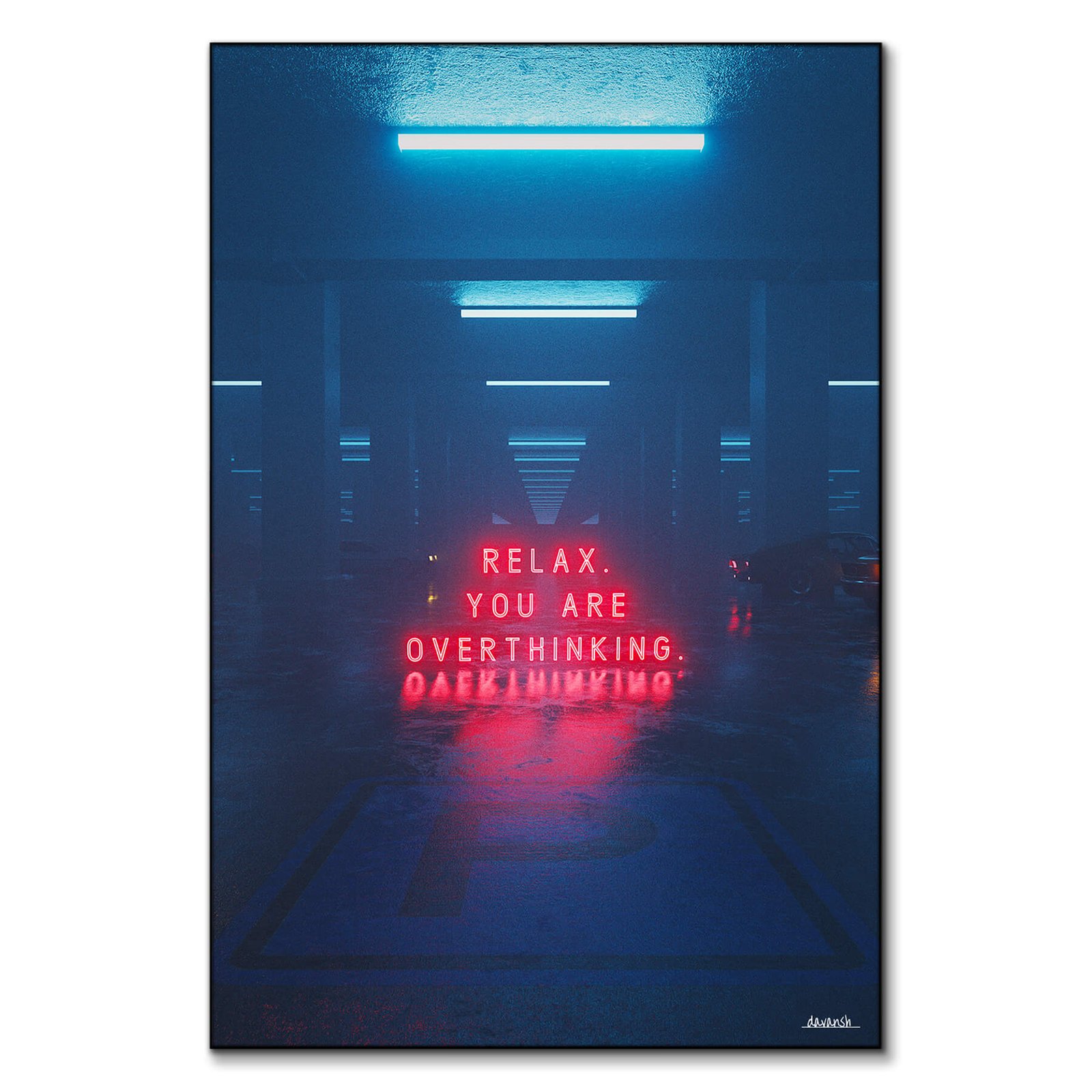 This image shows a red neon sign that says “RELAX. YOU ARE OVERTHINKING.” It’s in a dark place with tall columns and a wet floor that reflects the red light. It looks like it might be inside a big building or a parking lot. The place is mostly empty and has a mysterious feeling.