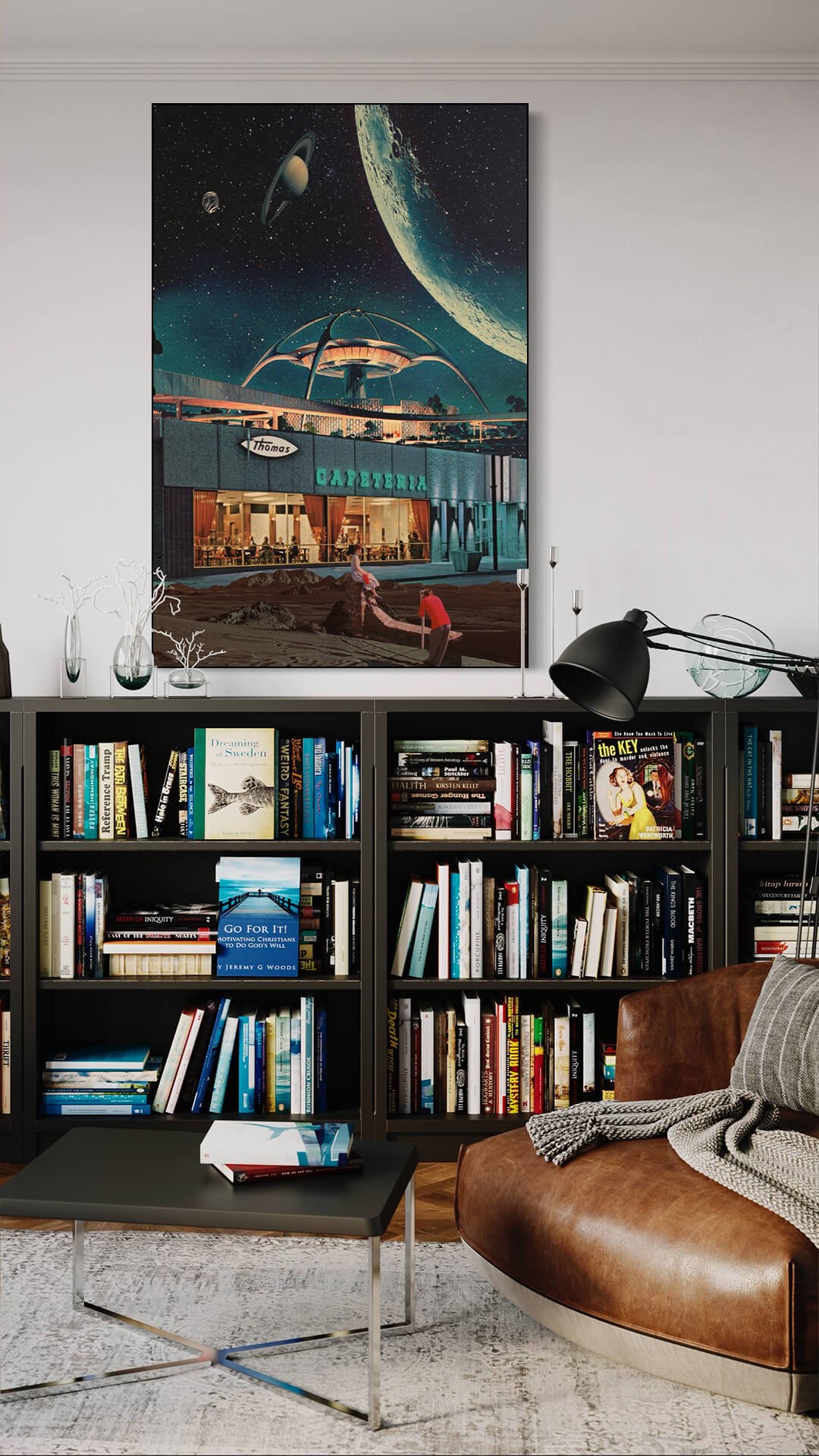 A space-age cafeteria with a mid-century modern design sits under a vast cosmic sky, planets and a moon hanging dramatically close. Two figures in the foreground appear engaged in a terrestrial activity, contrasted with the grandeur of the interplanetary vista behind them. This retro-futuristic scene merges the everyday with the extraordinary.