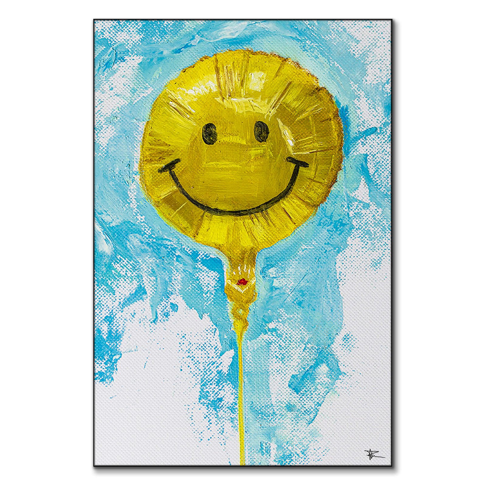 A bright yellow foil balloon hovers in the center, its cheerful grin painted with loose, confident strokes. Rough impasto brushwork adds metallic gleam, making the balloon look freshly inflated yet slightly wrinkled. A single ribbon drips downward, pulling a tiny red heart through the wet paint. Surrounding the balloon, layers of turquoise and sky blue collide, splatter, and fade to white, creating the feeling of confetti in motion. Texture varies from smooth glaze to dotted spray, giving raw energy. High-contrast shadows carve subtle depth into the smile, while flecks of white paint sparkle like sunlight. The vertical layout invites the eye to travel from top to trailing string. Every brush mark radiates upbeat emotion, a literal invitation to smile.