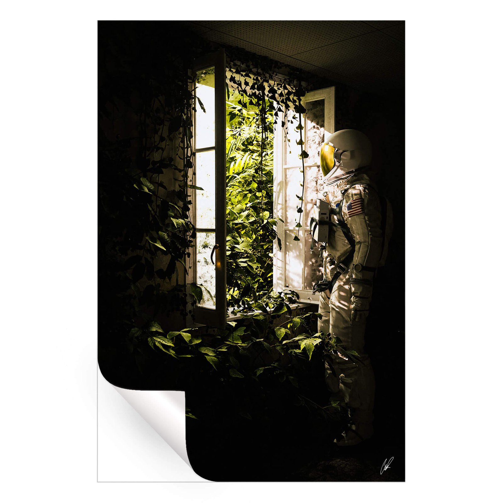 Light filters through the foliage, casting a glow on the reflective visor, as the astronaut seems to ponder the silent, leafy world before them.