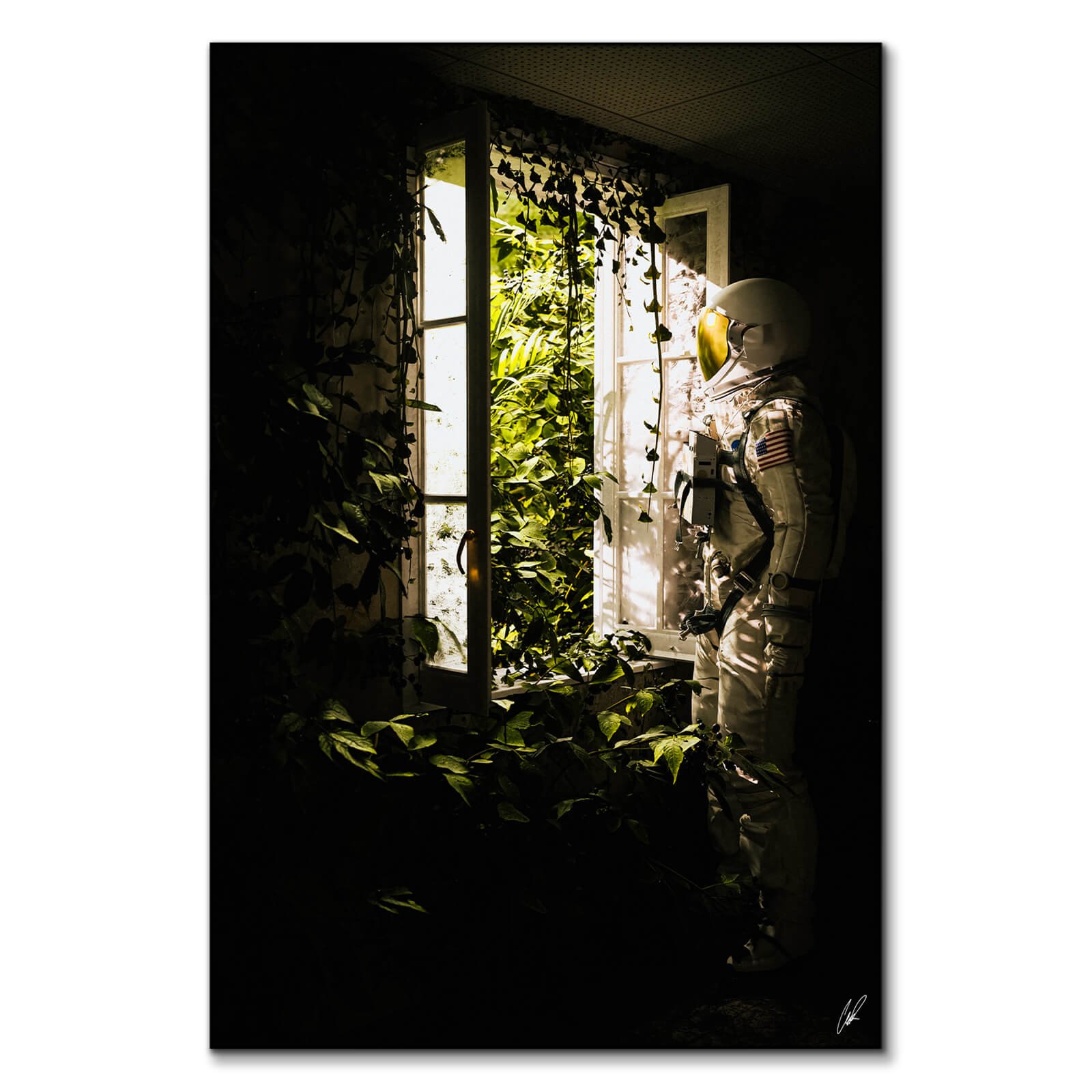 In CaptvArt’s piece, a surreal astronaut stands at the threshold of a lush overgrowth, a juxtaposition of human exploration against the wild reclaim of nature.