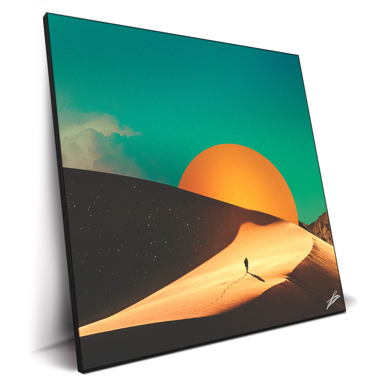 This striking wall art captures a surreal desert landscape where the boundaries of reality are artfully blurred. A solitary figure traverses an expanse of sand dunes under an oversized setting sun that bathes the scene in a dramatic play of light and shadow.