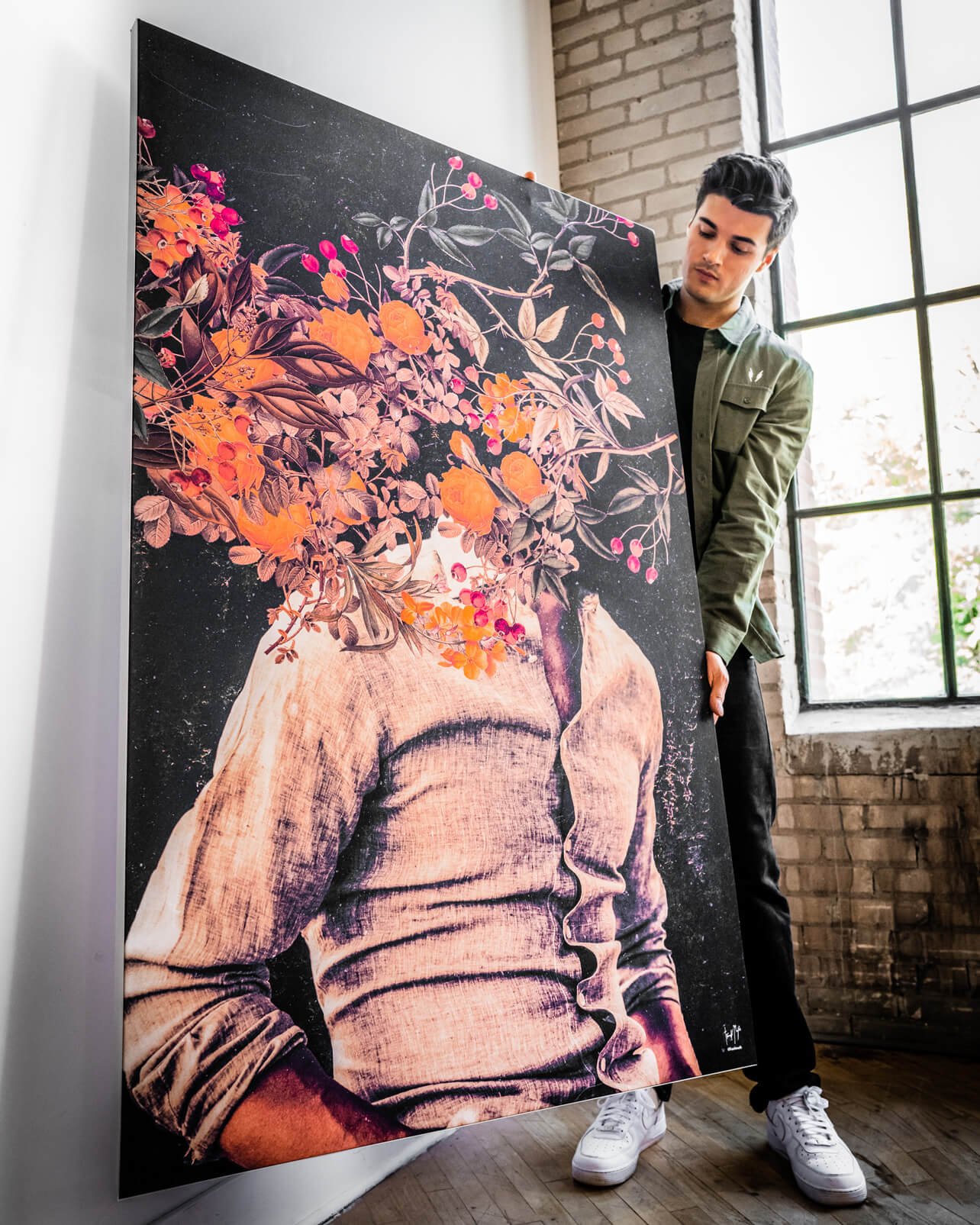 Award-winning collage duo Frank Moth works from Thessaloniki, transforming retro photography into poetic, floral portraits. Browse the broader Frank Moth artwork collection to see more indie prints that merge nostalgia with dreamlike surrealism. Their signature technique layers archival imagery, warm film grain, and bright botanical bursts – the same elements on display in “Roots.”